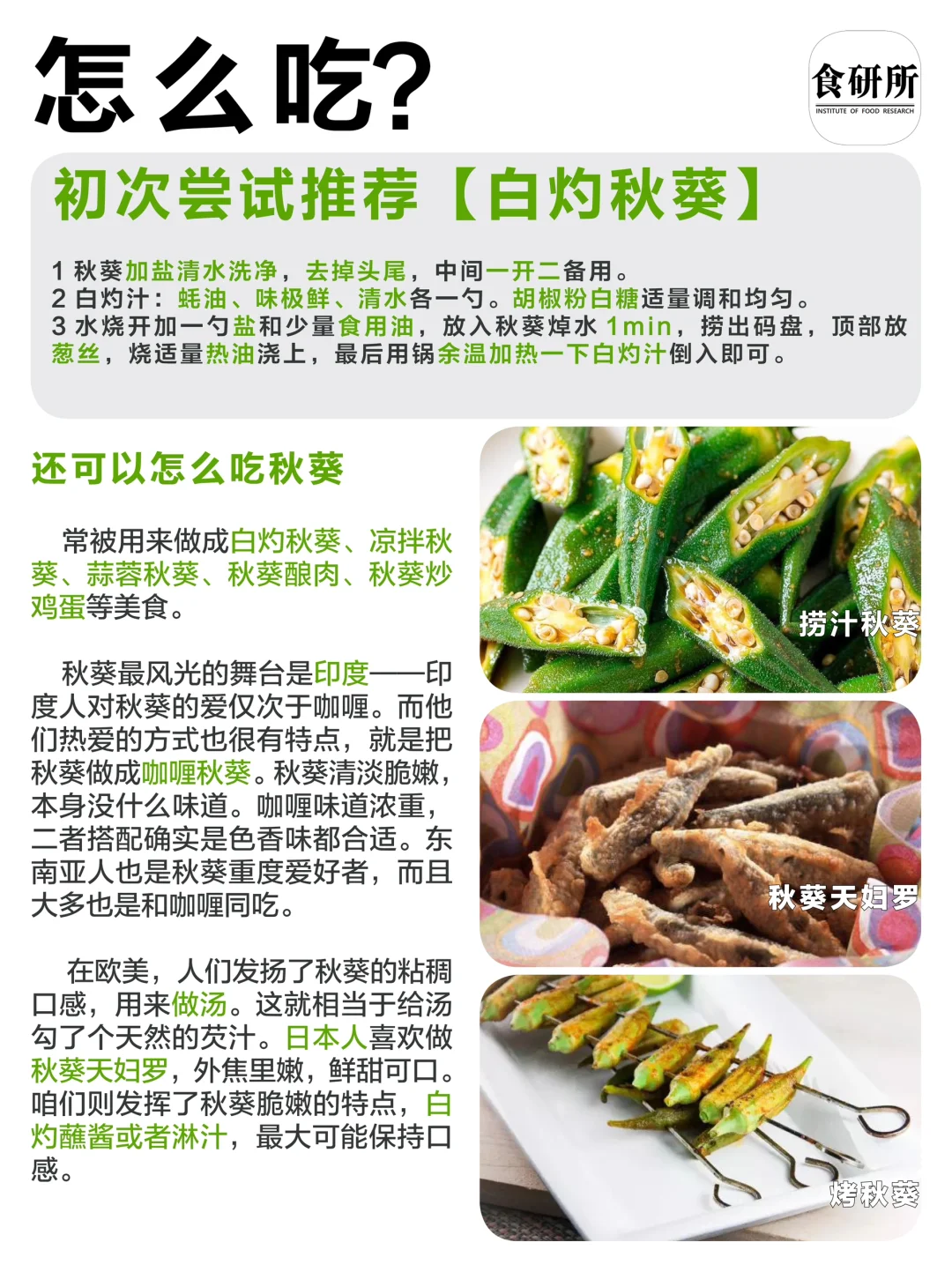 [庆祝R]在欧美,人们发扬了秋葵的粘稠口感,用来做汤。这就相当于给汤勾了个天然的芡汁。日本人喜欢做秋葵天妇罗,外焦里嫩,鲜甜可口。咱们则发挥了秋葵脆嫩的特点,白灼蘸酱或者淋汁,最大可能保持口感。