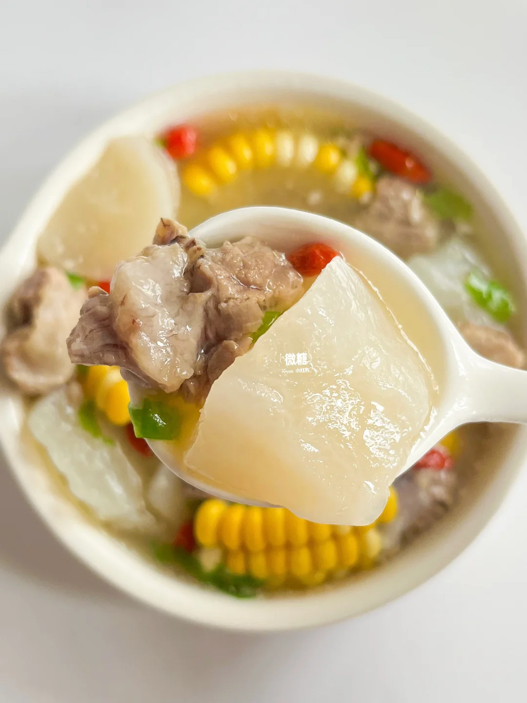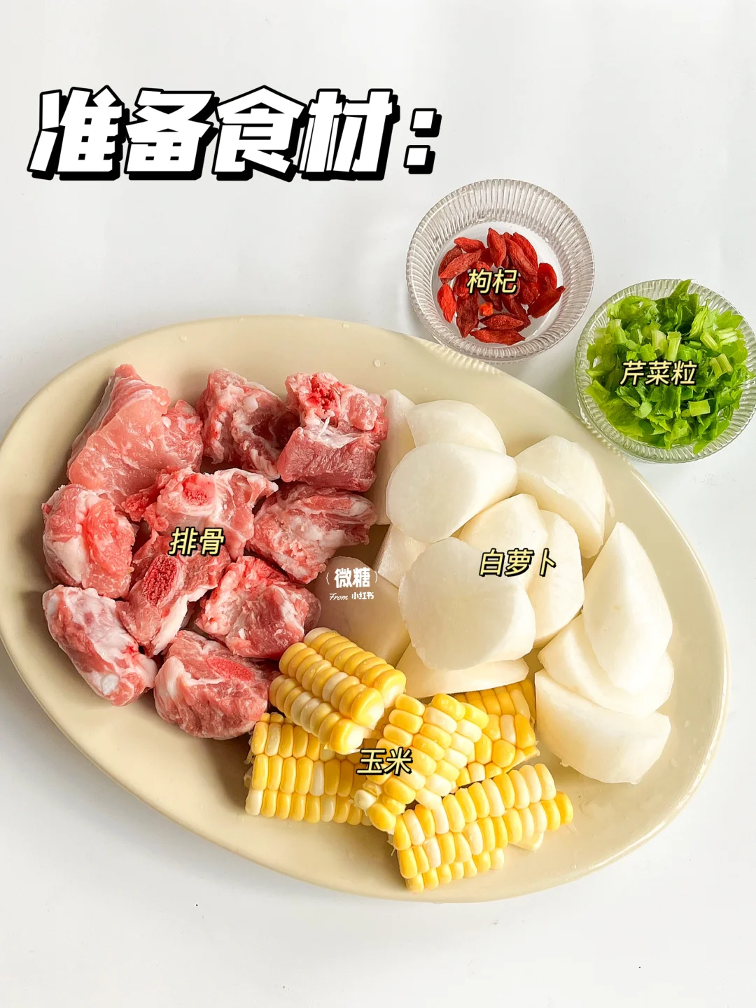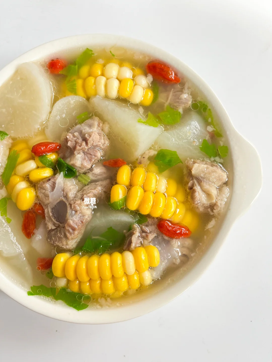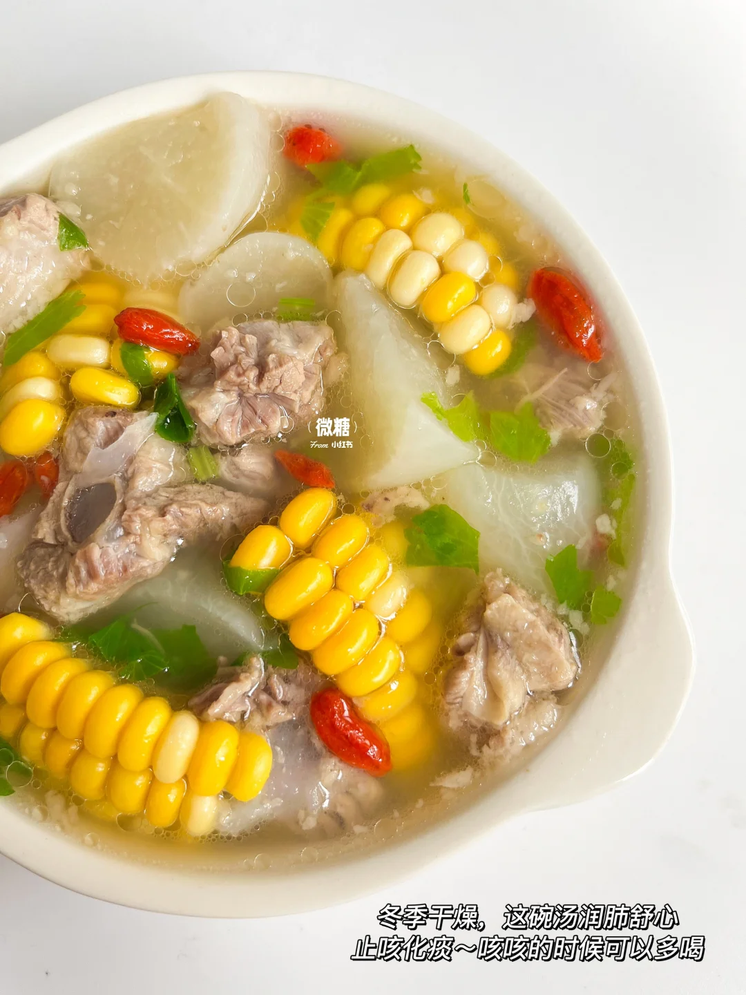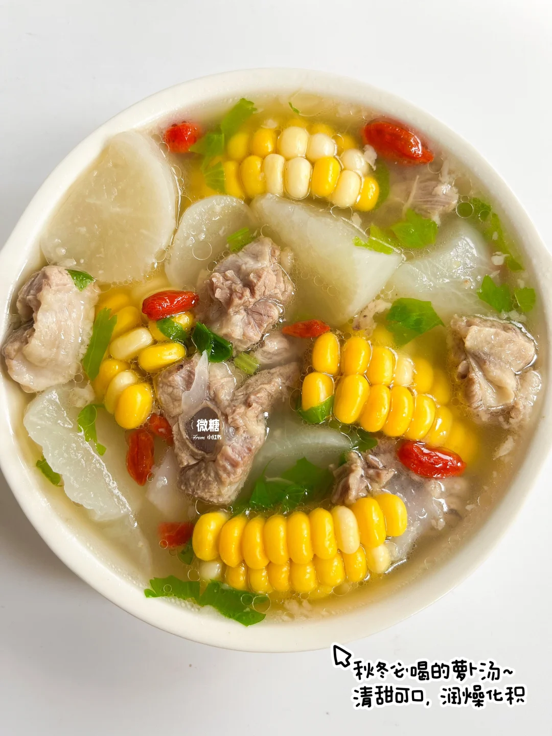 冬吃萝卜夏吃姜,冬季怎么能少得了一碗热乎乎的萝卜排骨汤呢!都是食材原汁原味的鲜美🥰汤清味美,肉香四溢~ 关键这萝卜汤的好处多多哦⭕️化痰消积,清润降燥,咳咳的时候要多喝这款汤哦!生病食疗就喝它👌🏻 ⭕️准备食材: 排骨,白萝卜,甜玉米(没有可不加),枸杞,芹菜 👩🏻🍳做法: 1️⃣排骨冷水下锅焯出血沫,捞出后洗净 2️⃣排骨加适量的清水先煲30分钟。再加入萝卜和玉米继续煲20分钟 3️⃣开锅后撒芹菜粒和枸杞,最后加点盐调味即可✅ 这款汤就是很清甜鲜美,一点儿不会油腻~