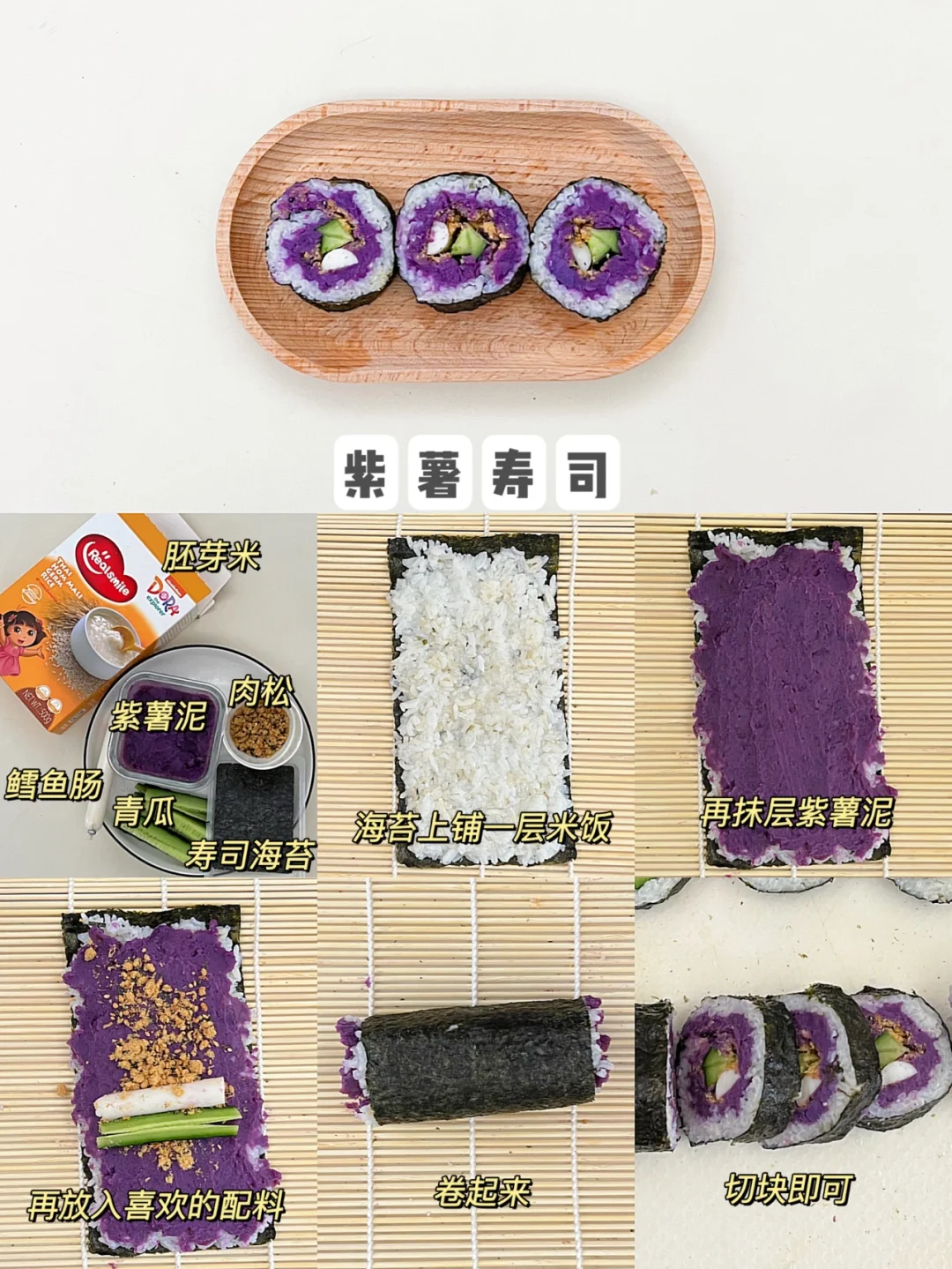 食材:RealSmile胚芽米,寿司海苔,紫薯,肉松,青瓜,鳕鱼肠