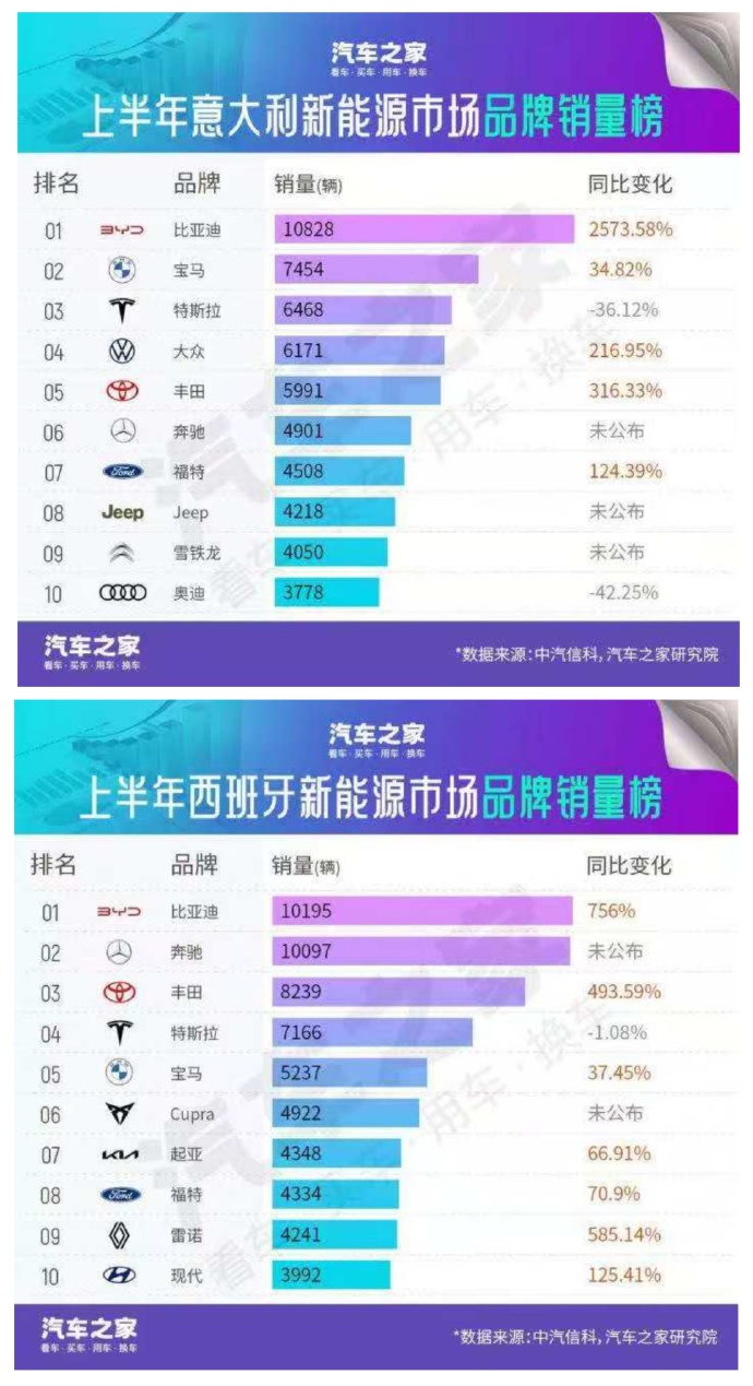 不仅在国内成绩亮眼,比亚迪更是霸榜欧洲车市,成为中国品牌出海的新标杆 今年上半年,比亚迪在欧洲新能源市场的表现较为突出。据统计,其以 71,345 辆的销量位居中国品牌首位,同比增长 322.99%,显示出在当地市场的拓展成效。 具体到车型,比亚迪 Seal U(宋 PLUS)上半年销量达 32,802 辆,在欧洲中国品牌新能源车型中销量领先,同比增幅为 3727.54%,这一增长与产品定位和市场需求匹配度有关。 从全球市场看,1-8 月比亚迪累计销量 286.39 万辆,同比增长超 23%;其中海外销量 63.07 万辆,已超过 2024 年全年海外销量总和。目前比亚迪进入全球 116 个国家和地区,欧洲门店超过 400 家,这种规模化布局为销量增长提供了基础支撑。作为全球销量前十的车企,其海外市场的稳步拓展反映了中国新能源汽车的出海进展。