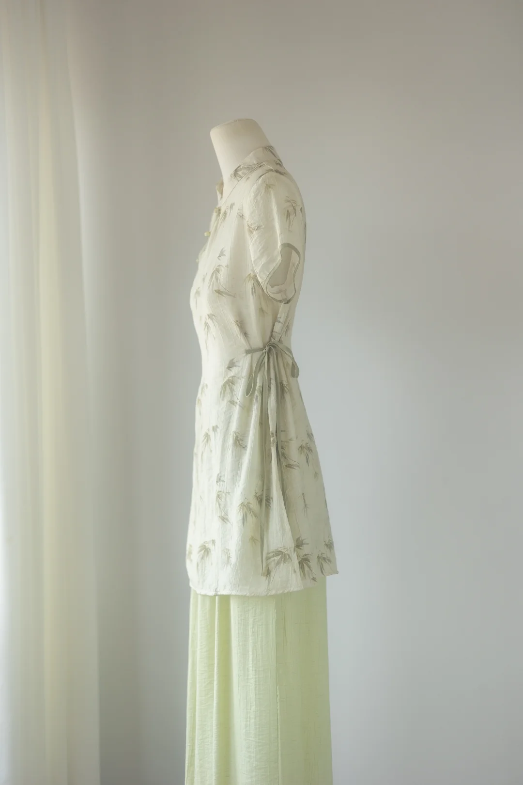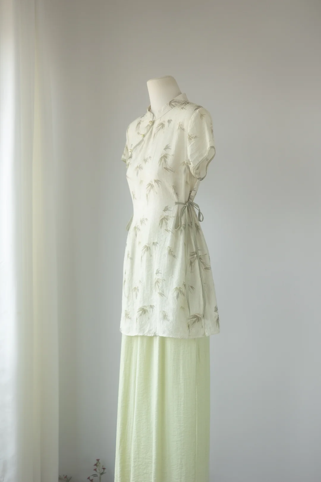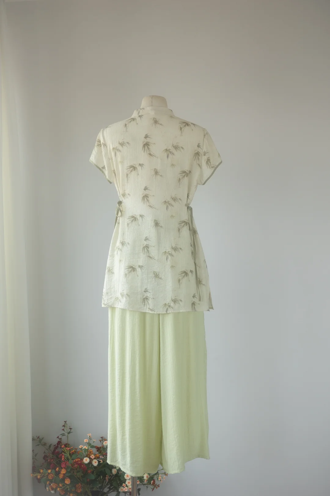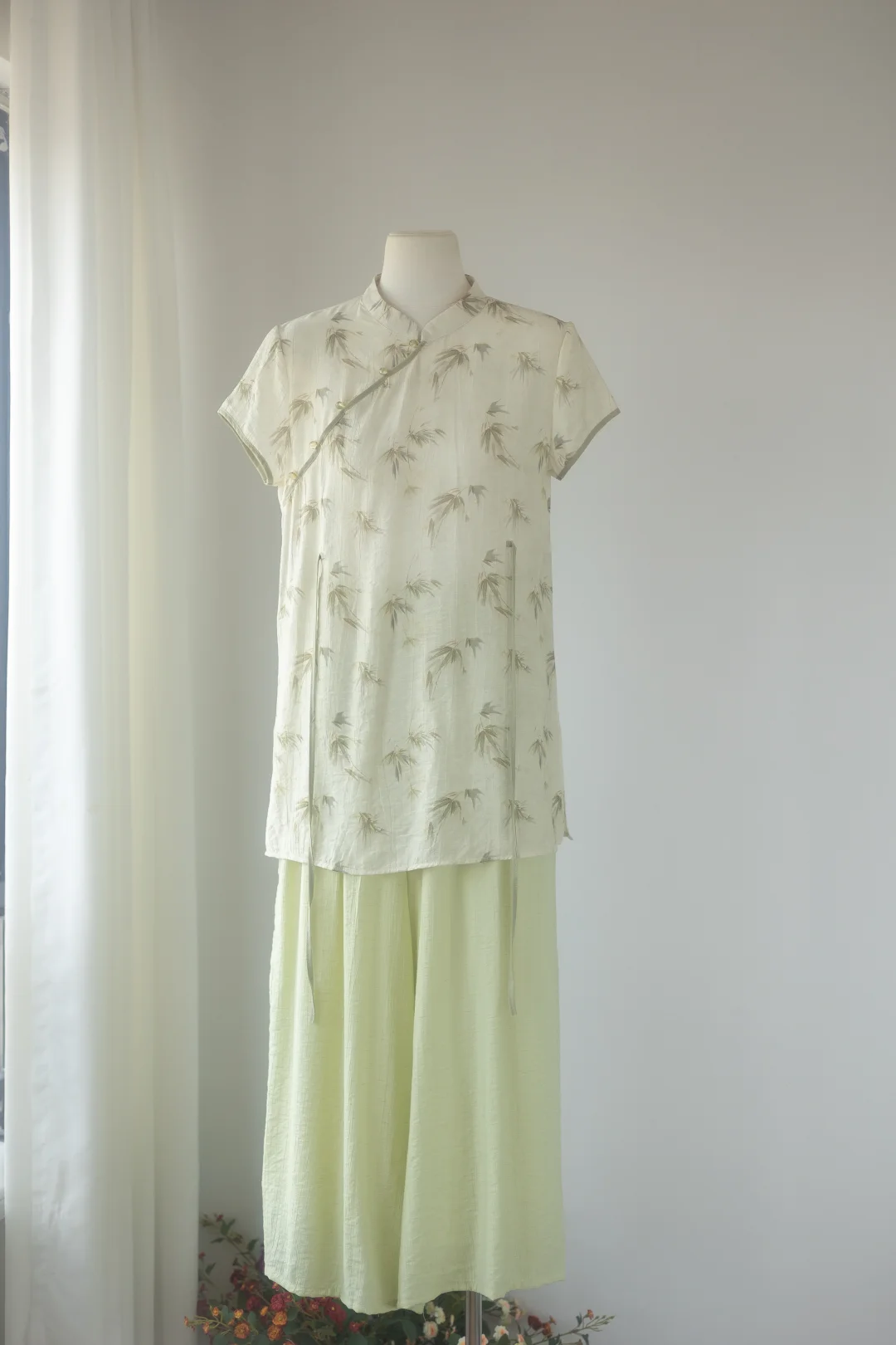 绿色同色系搭配在夏天就是视觉降温 直接变身氧气少女~ 绿色竹子清冷大方 宽松版型包容性超级好 靠系带来调整腰部维度 简直就是梨形天菜~对身材无可挑剔 搭配同色系直筒裤,裤长90左右 单穿搭配T恤也是好看的 -