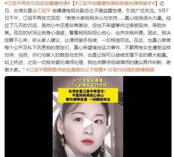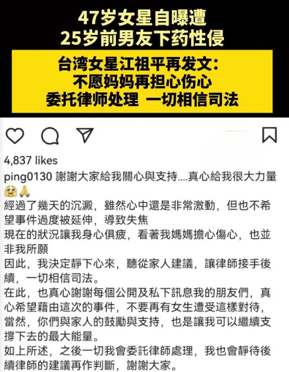 近日,中国台湾女星江祖平自曝遭受性侵事件引发广泛关注。9月7日下午,她再次发文回应,感谢各界的关心与支持,并表示家人的陪伴和公众的鼓励给予她巨大力量。经过几天沉淀,她虽心情仍未平复,但为避免事件失焦、减轻母亲忧虑,决定暂静下心来,委托律师处理后续事宜,一切尊重司法程序。她也呼吁社会关注女性安全,希望此类事件不再发生。最后,江祖平表示将依律师建议再做进一步应对,并衷心感谢所有支持她的朋友。 此前,江祖平晒出一张全黑图片并发文回应自曝遭性侵,她表示自己很累,心力交瘁,感到害怕:“他们知道我住哪里……我真的连外卖都不敢点。”