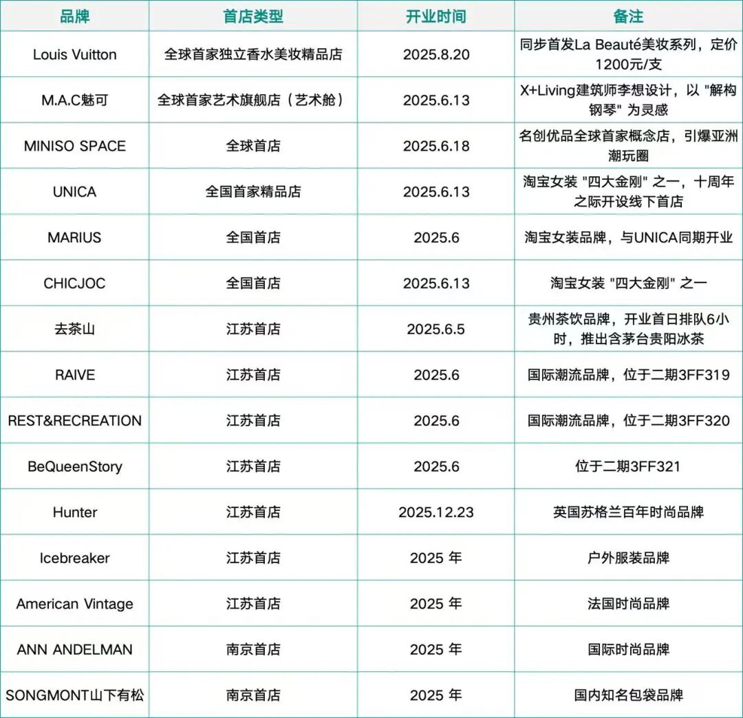 除了全球首店,还有12家全国首店、8家区域首店、48家江苏首店。它没有把自己困在“高奢”的牢笼里,而是从顶级奢侈品,到网红潮牌,再到从线上突围的黑马品牌,构建了一个全客层的“首店磁力场”。