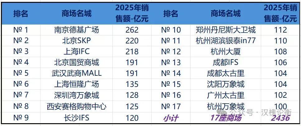下表:基于开源信息,依据主要明星商场年度销售额指标,2025年中国大陆共有17座商场年销售额过百亿(图源:汉槐论衡)