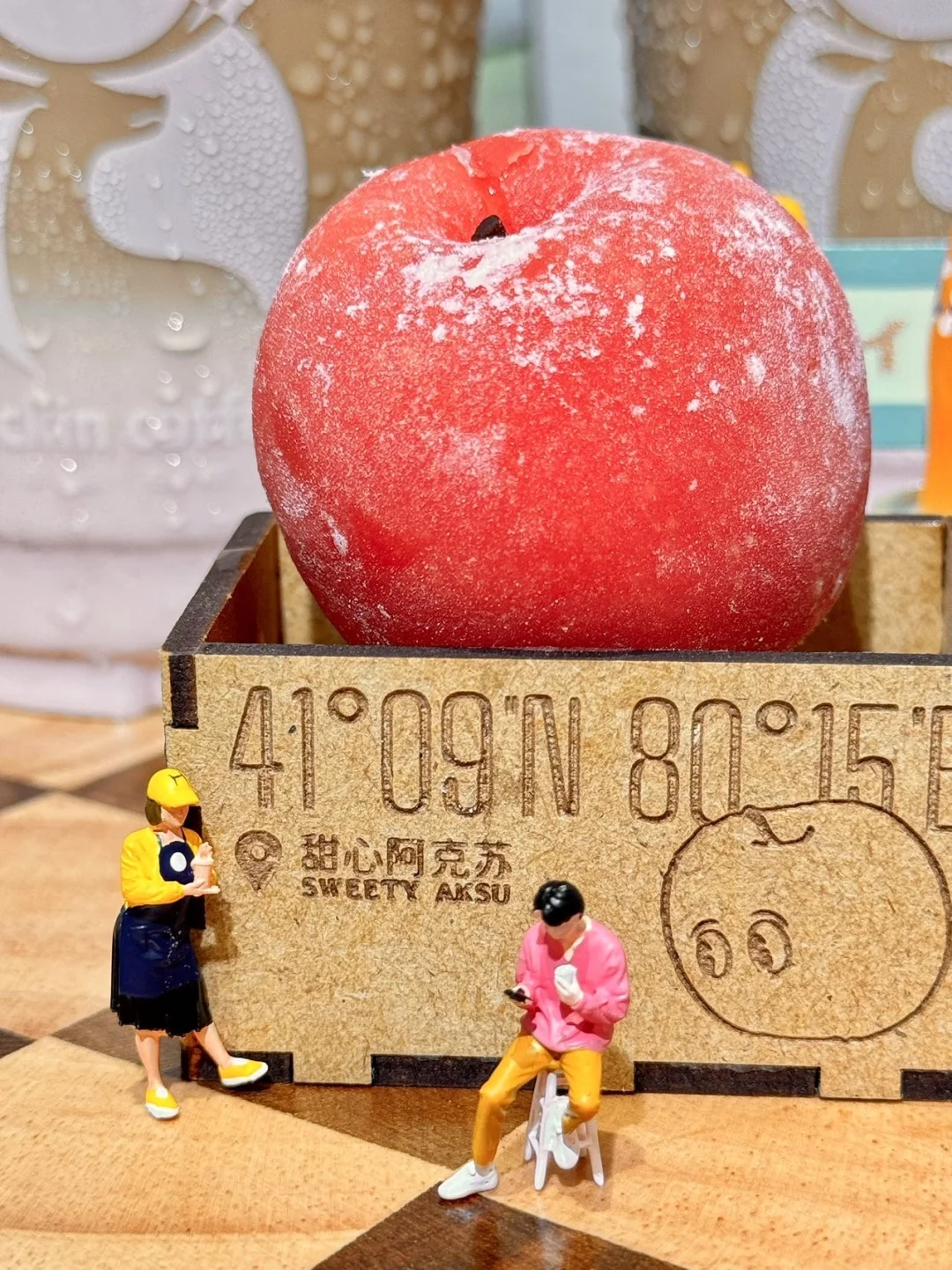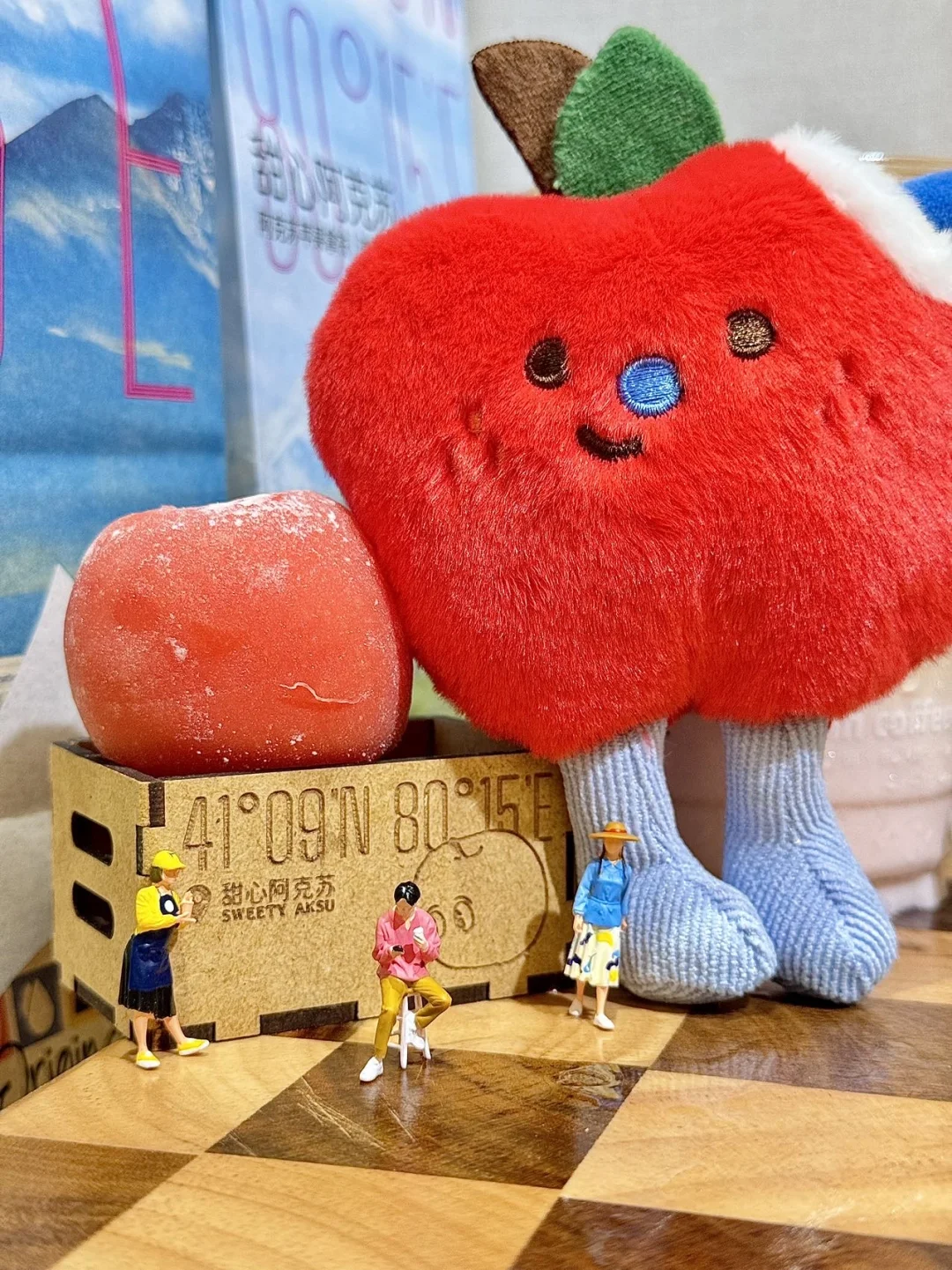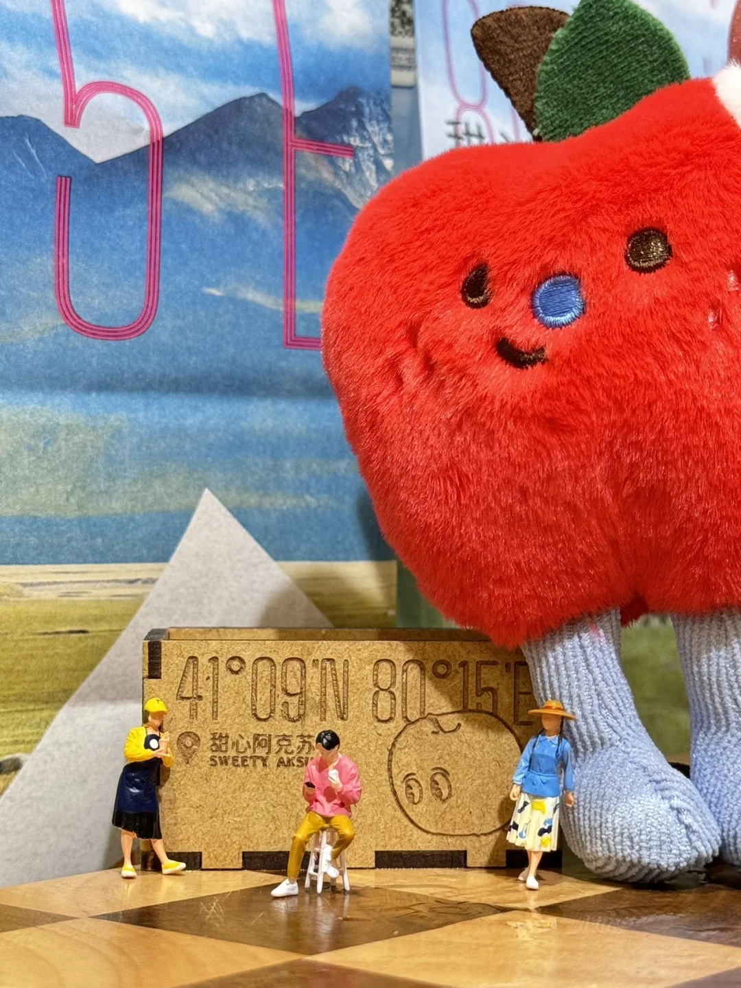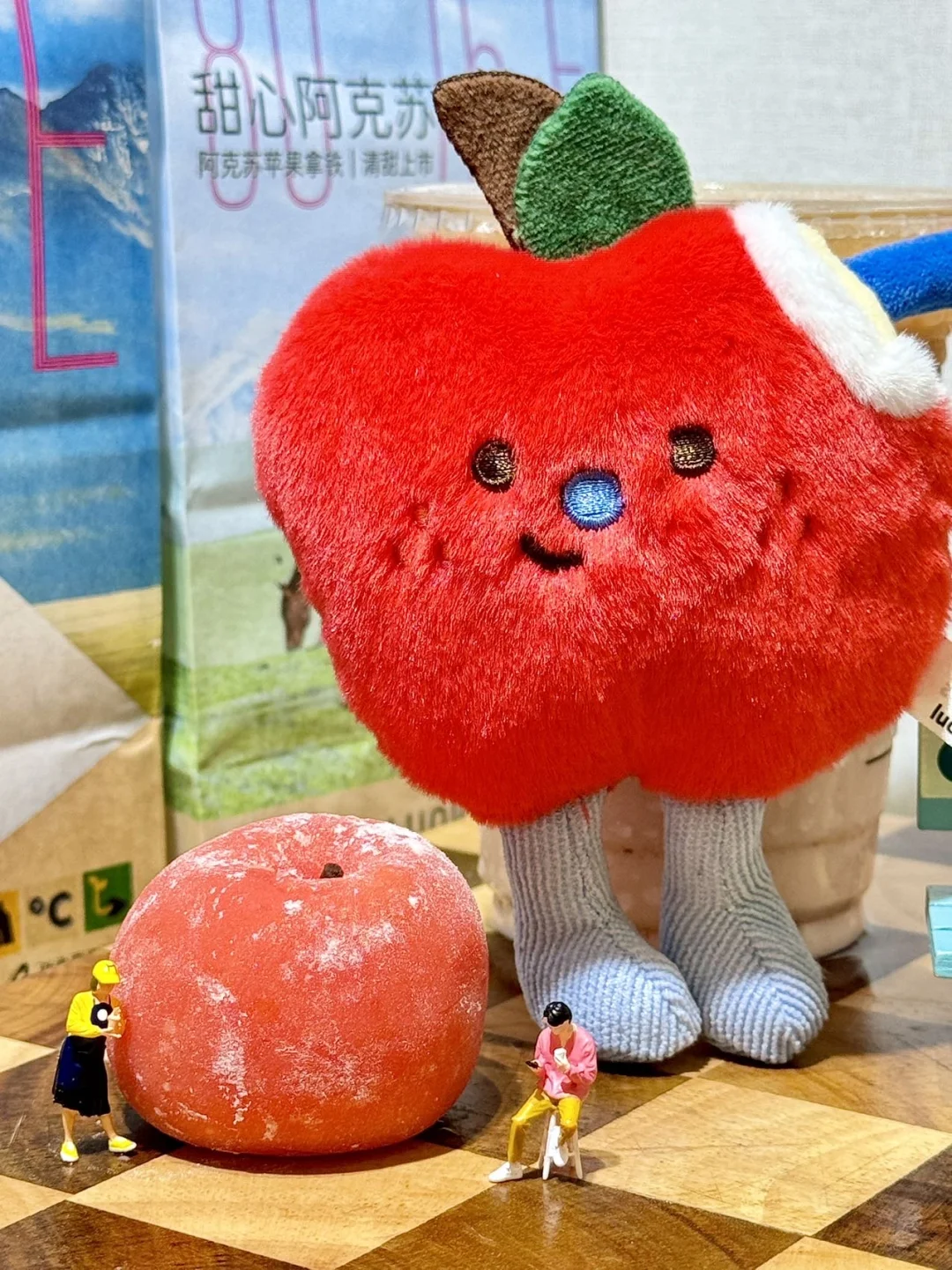 瑞的周边苹果挂件都拿到了吗!! 随手摆进我的mini小人场景里 直接上演苹果大王入侵小人国名场面!! 看这苹果箱挂件!像从新疆阿克苏空投来的! 小人儿踮脚够还够不着!毛绒挂件软fufu的! 阿克苏苹果拿铁也喝上了!一口惊艳☕️ 阿克苏苹果微甜清爽🍎 混着IIAC金奖咖啡豆的香!喝着轻负担! 小人儿都好像在旁边盯我的这一杯!! 大声说!9.8双杯套餐就有这俩挂件! 这波我先替你们试过了! 不会出错!