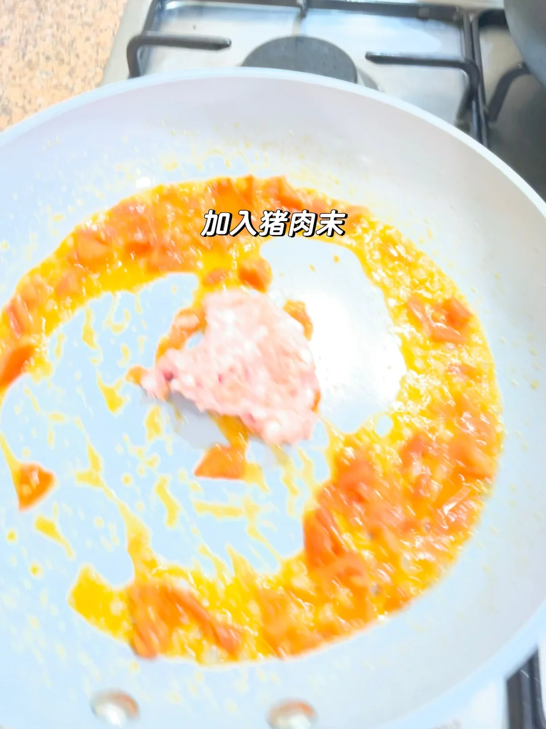2️⃣加入肉沫快递划开,肉沫炒熟变色(过程中可以少量加水)