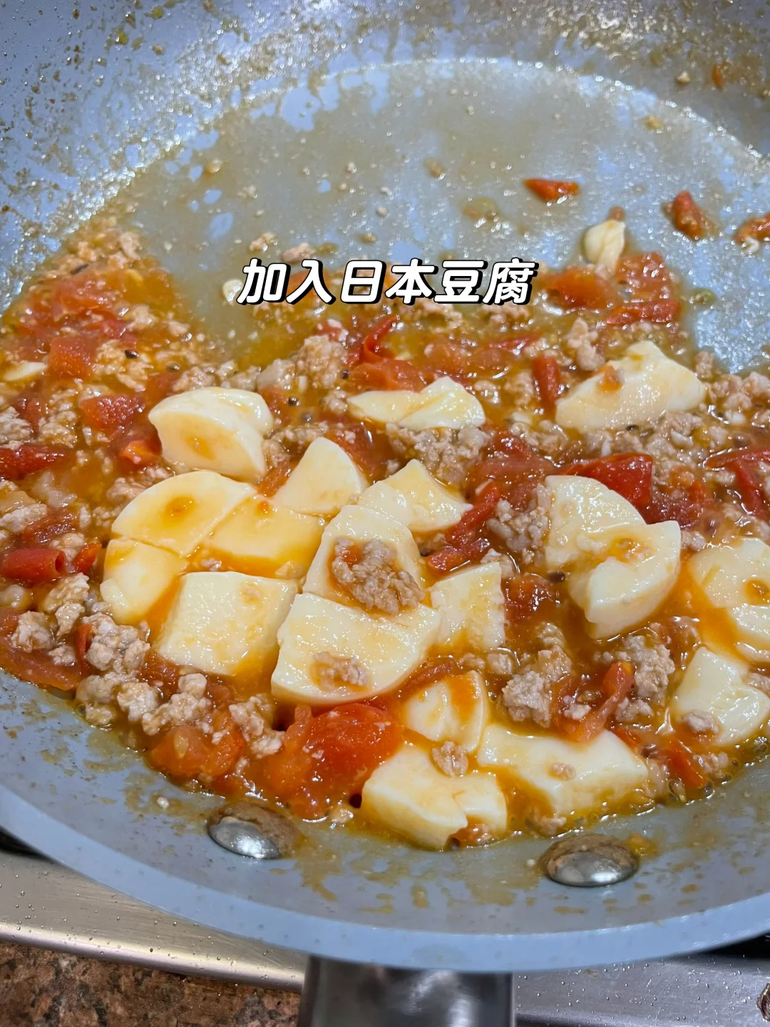 3️⃣放入豆腐块轻轻推动混合(不要大力搅拌会碎!)