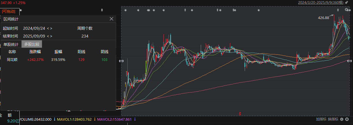 拉长时间看,自去年9月24日以来,同花顺累计涨幅超240%,并于今年8月18日触及历史最高点426.88元/股。