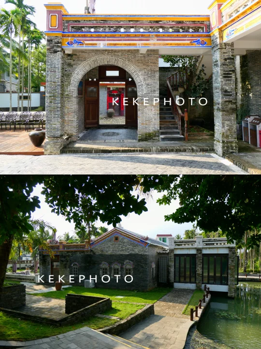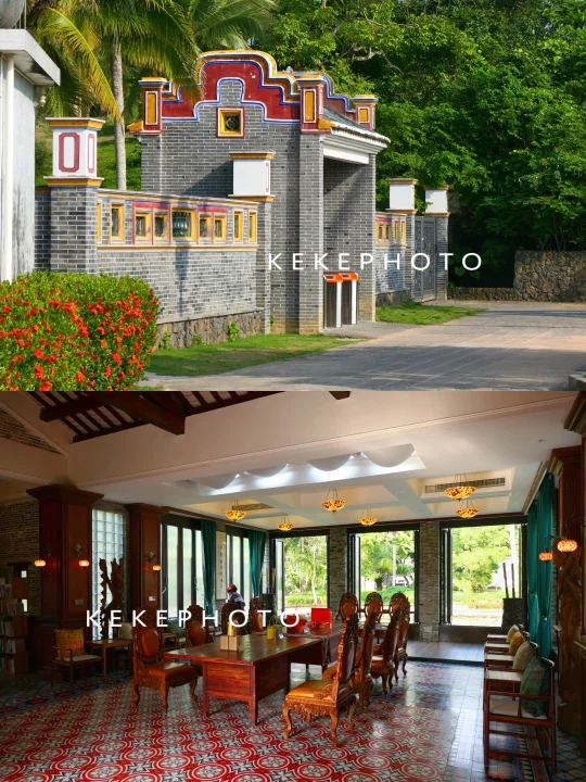 中式元素:传统琼北民居的“一明两暗”格局、飞檐翘脊、灰塑装饰、龙凤宫灯木雕、吉祥图案(如牡丹象征富贵)、封闭式天井(采用“天生来水”的排水设计,据说不管下多大的雨都不会积水)。