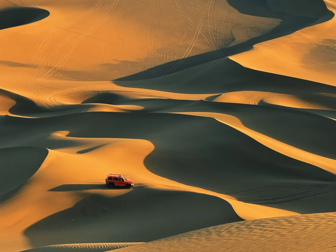 👉库木塔格沙漠,三点多出发,驱车俩小时,开车走国道沿路都是戈壁美景!坐越野车进沙漠,依然不用门票,体验感拉满,越野车横穿沙漠,还带滑沙项目!七点半被带到沙漠山顶看日落~这是在新疆十天,玩的最开心的一天!