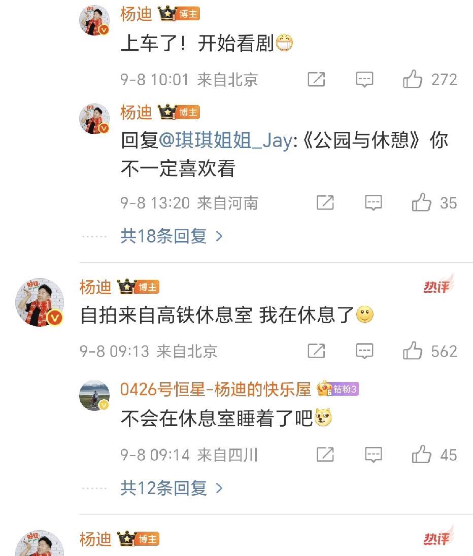 杨迪错过原先9点的高铁! 哈哈哈,那表情那动作,应该是已经在高铁上了吧。瞧瞧评论区,确实是上了高铁了,但是错过了原先9点的,改签了之后的。 网友评论:“没想到 有一天迪哥赶高铁也会迟到…”哈哈哈,确实是没想到。杨迪迟到,没想到行李箱还从司机的后备箱掉落砸到地上…这一切都过去了,迪哥已经坐到了高铁了,虽然不是同一班。 确实赶高铁或者动车迟到了,会让人当下整个心情不是太好。后来顺利,也算是一种补偿[呲牙]