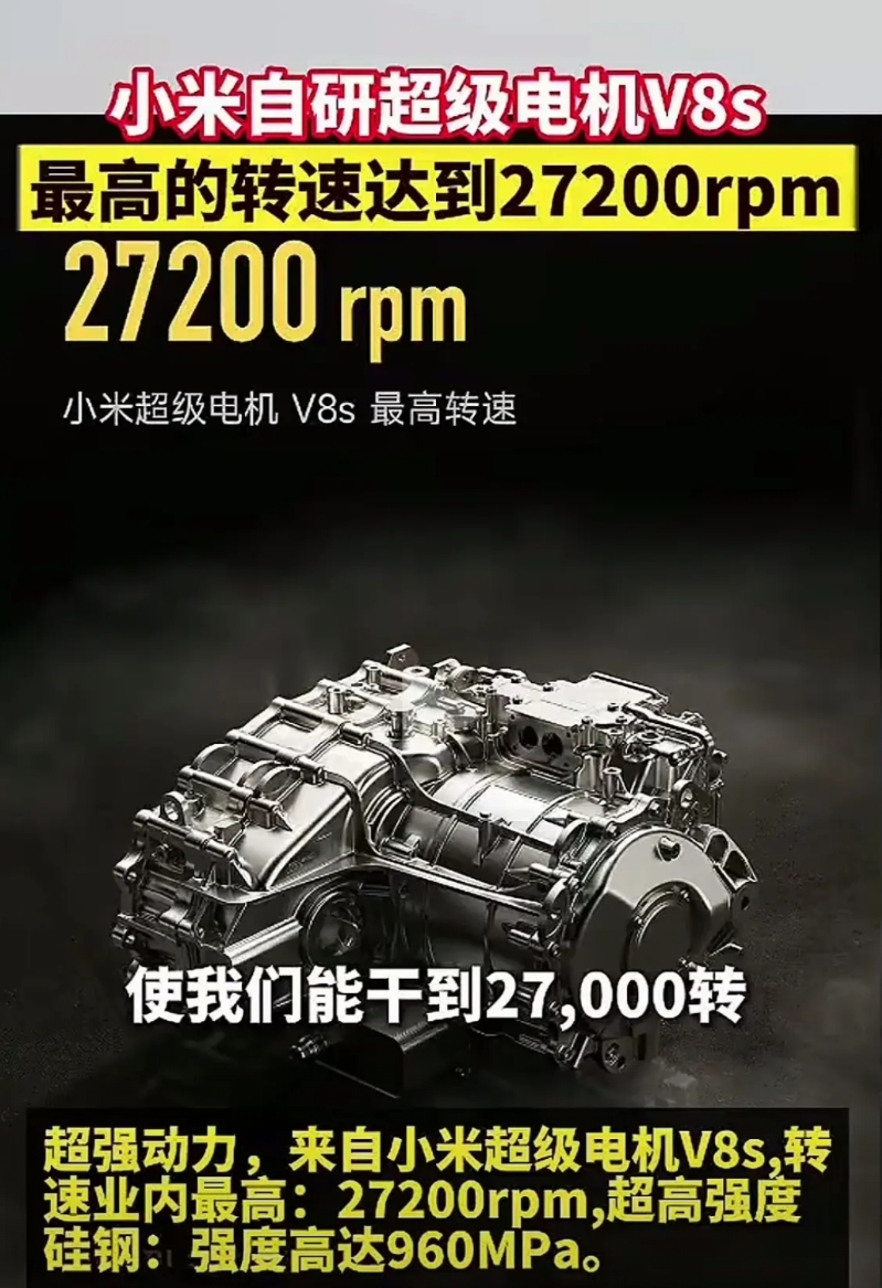 小米自研超级电机V8S转速高达27200rpm,这个水平已经是行业最好的了吧。能做的这个水平因为小米在材料上下了很大的功夫,其研发的超高强度硅钢,强度高达960MPa,小米电机还会用上碳纤维材料,到时候30000rpm都不是问题。