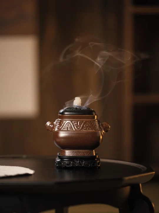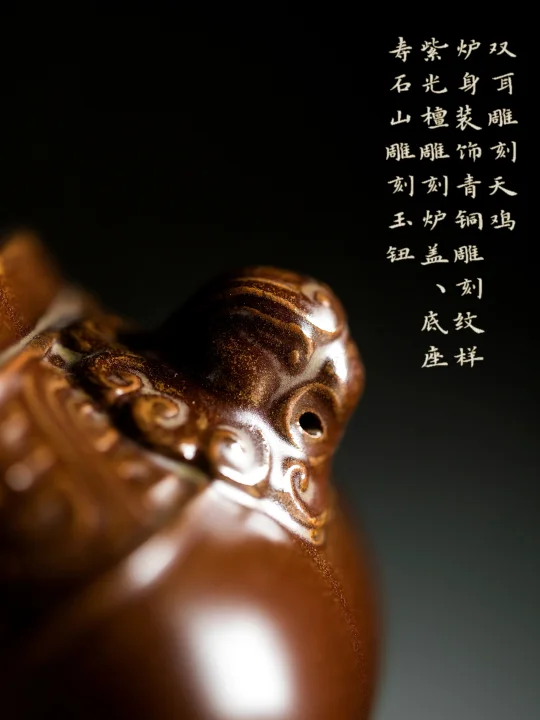 天鸡双耳聆风唤日,远古山河纹镌刻四方安定之愿,此炉承宣德遗风,明清两朝多见于帝王书房,紫光檀底座托起江山永固之思,烟起时恍见帝王执笔沉吟。