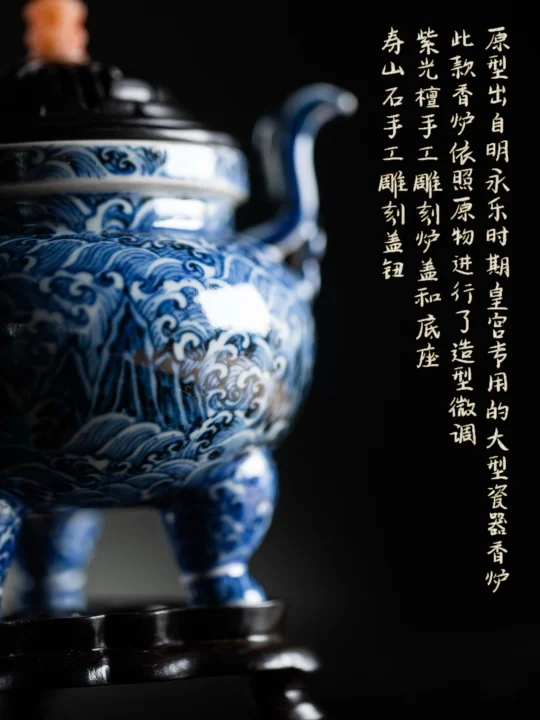 海水江崖纹卷起永乐盛世波涛,原物藏于国博与御窑博物馆,今微缩为案头小器,青花笔意依旧磅礴,紫光檀盖钮轻合时,似将大明山河纳入方寸之间。