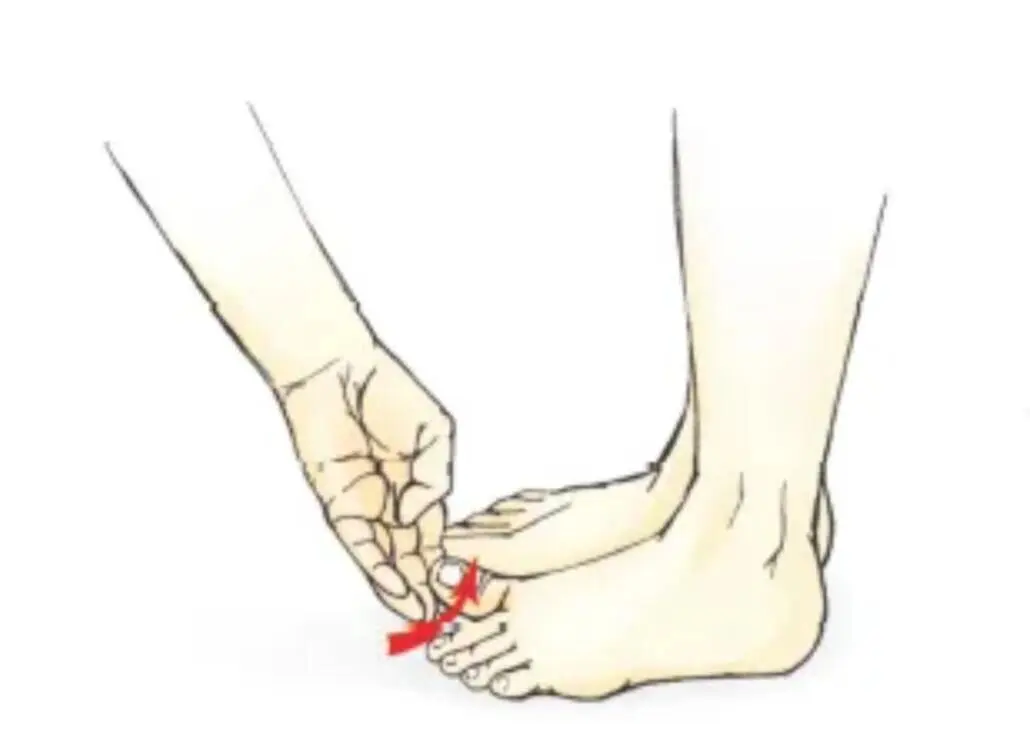 以右脚为例,在走路时,当右脚推进且左腿摆动向前时,右脚𧿹趾处于伸展状态。如图三。