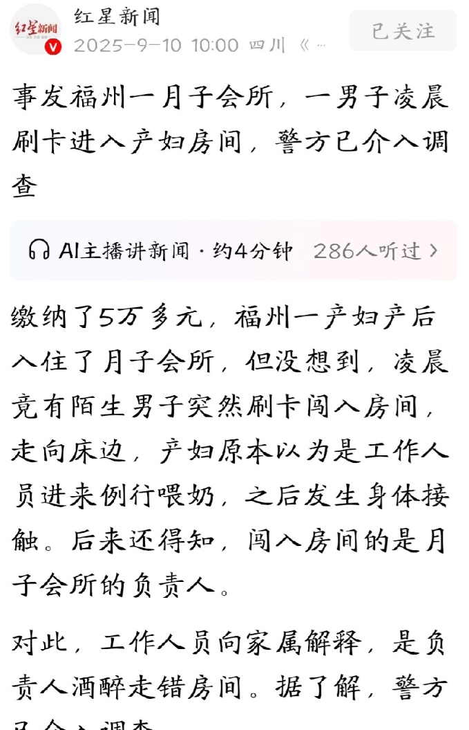福建福州,女子生完孩子,花5万块钱住进一家月子会所。本想着好好坐个月子,谁知,凌晨时分,竟有人突然刷卡闯入房间,还径直走向她床边,跟她发生了肢体接触。女子原本以为是工作人员进来例行喂奶,仔细一瞧,竟是个陌生男子。女子吓得尖叫,对方这才仓皇而逃。事后,女子查看监控,竟发现该男子是月子会所的负责人。会所管理严格,进出房间都要刷卡,负责人究竟是如何进来的?会所给出的解释让人气不打一处来。