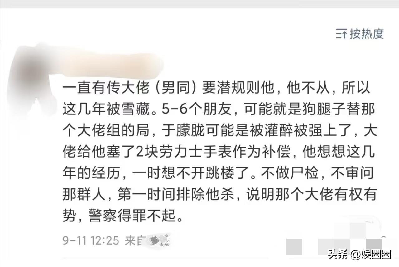 于朦胧意外离世。 说不是被做局真的难以说得通,我总结了以下几点疑点: 1.在自己家和朋友聚餐,却自己反锁门睡觉不管朋友,常人怎么也得招呼好客人才会休息吧,而且睡觉就算了还反锁门,这太不合常理了。 2.醉酒却能扣开纱窗。正常人醉酒基本不省人事,丧失行为能力和无行为目的性,喝醉了还能生生把纱窗扣开,这得用多大力气,不是求生本能估计难做到吧。 3.口袋里兜着所谓朋友的劳力士手表,这就有点此地无银三百两,就算好朋友之间开玩笑,这么贵重的东西能发现不了不见了吗?谁睡觉还兜着两个表?这明显有意污蔑。 4.死亡消息一传出立马就说帽子叔叔已经排除他杀嫌疑,早上6点多被发现,这么快就能调查清楚嘛?这结论下的是否太过仓促了!
