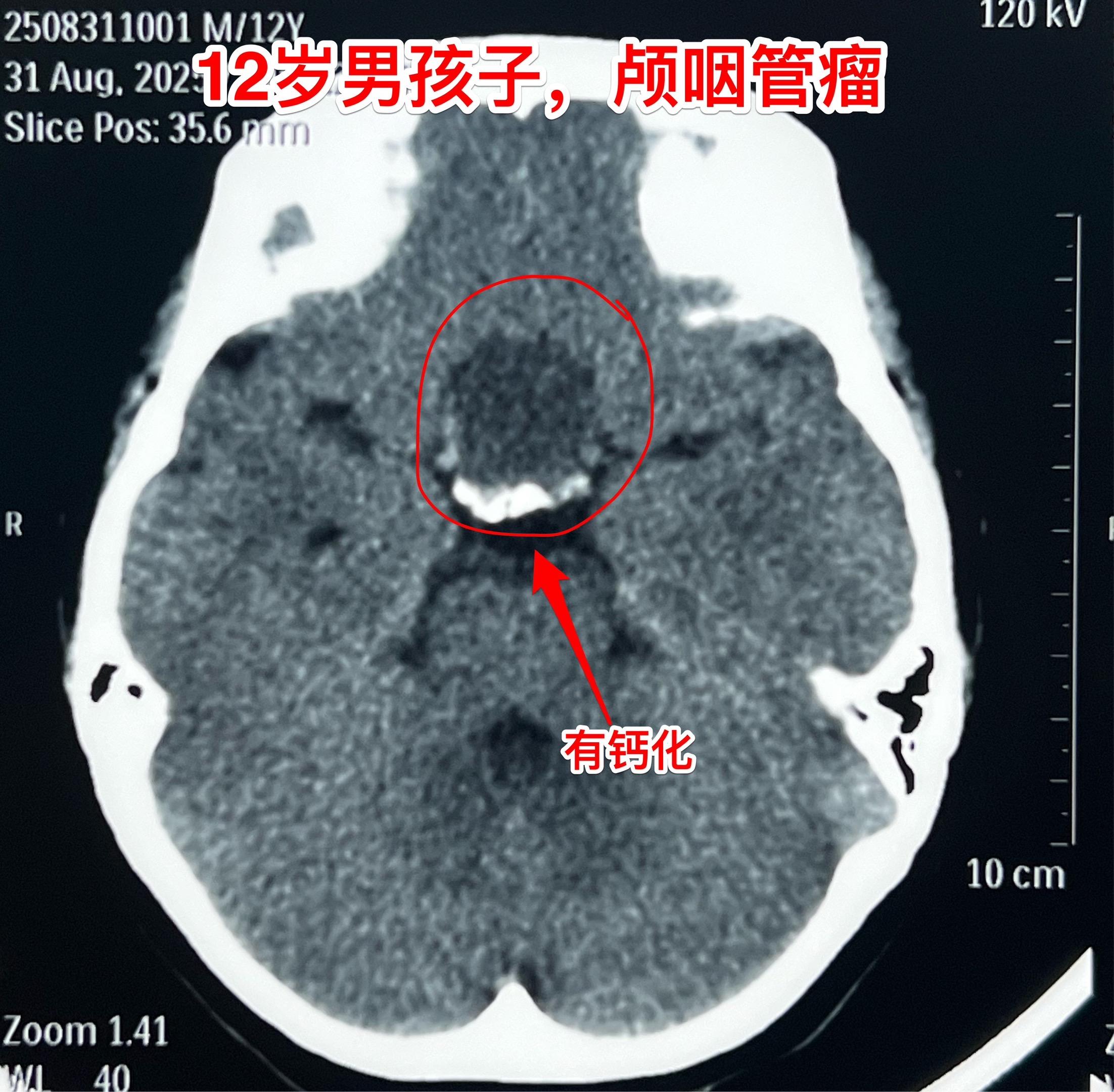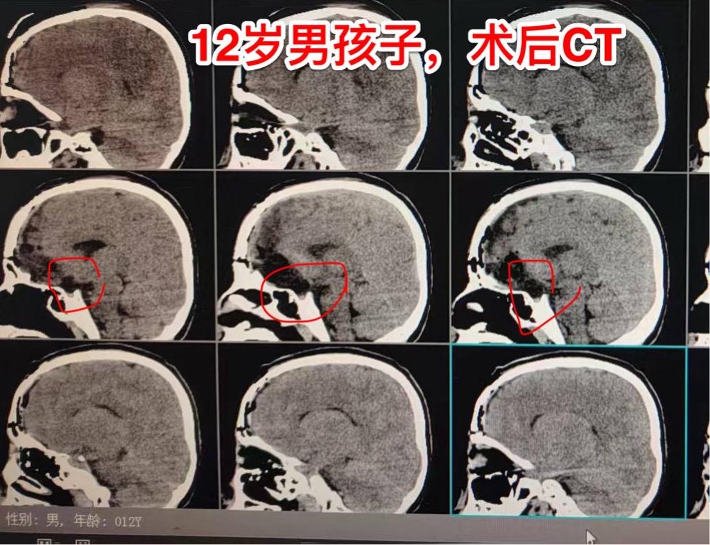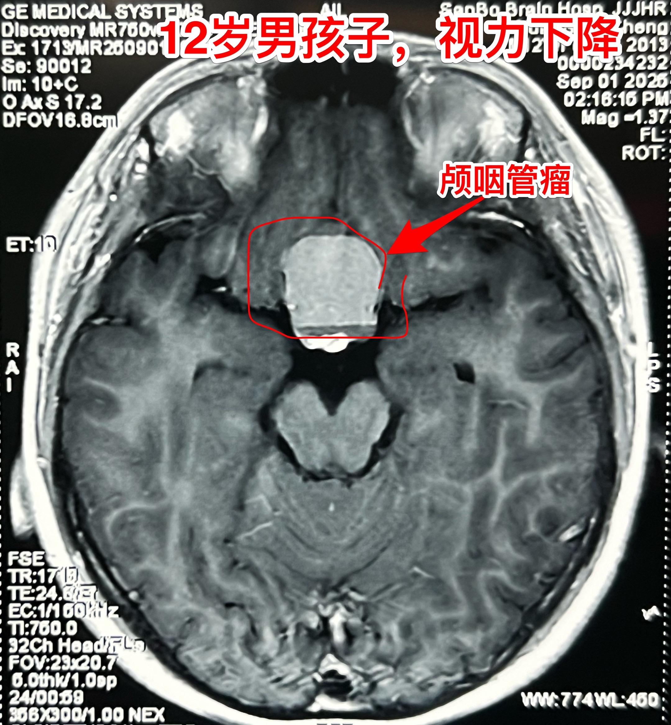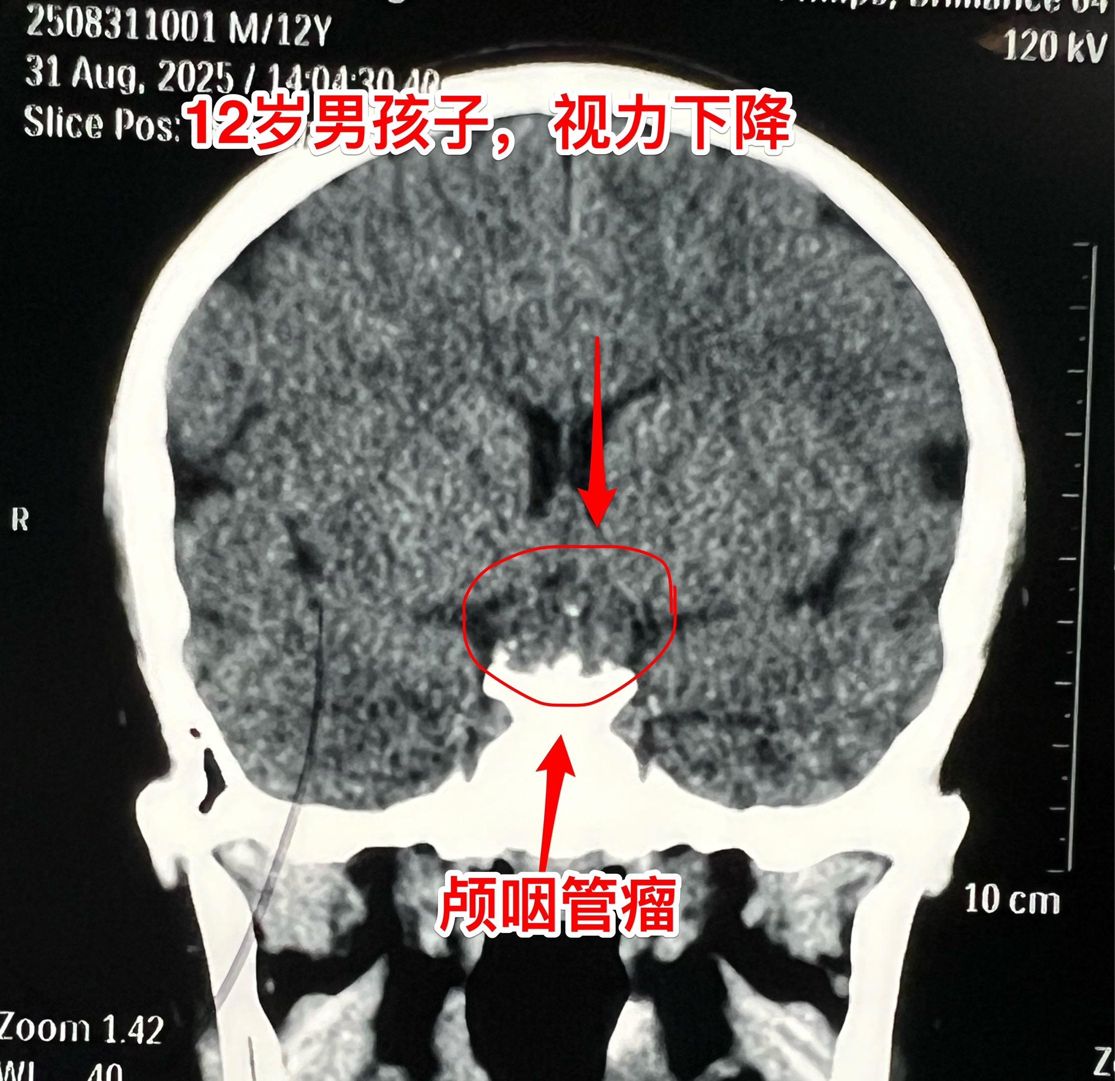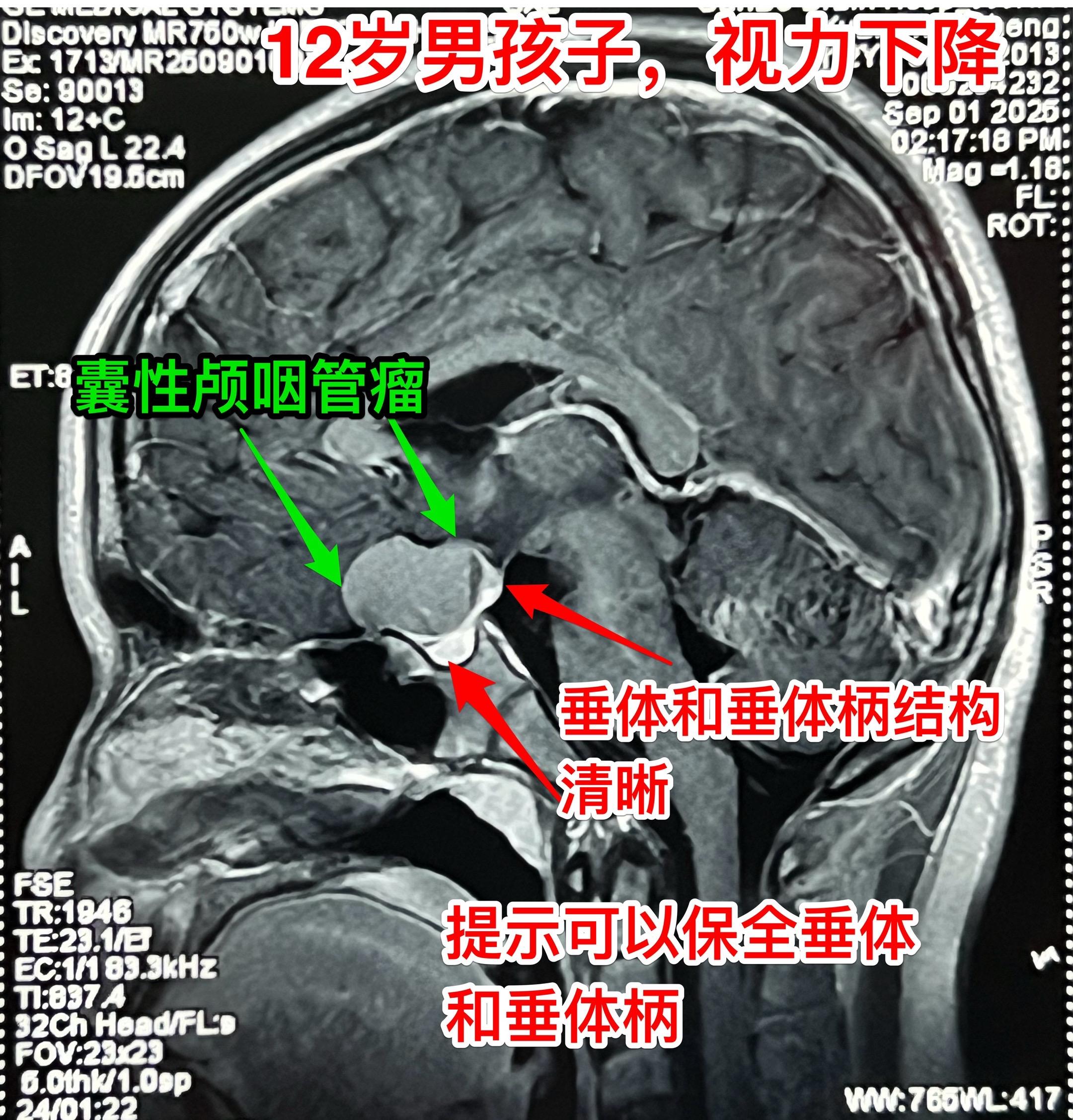 常规一天两个颅咽管瘤手术。今日两个颅咽管瘤手术。 上午第一个是12岁男孩子,江西人。八月份因视力下降到当地医院检查发现颅咽管瘤。八月底找我看病时双眼已经没有有效视力了。 磁共振和CT见图。图2标注:垂体和垂体柄结构清晰,提示在切除肿瘤时垂体和垂体柄很有希望得到保留。 肿瘤切除后垂体柄和垂体保护完好。可以预见男孩子的垂体功能应该会很好👍