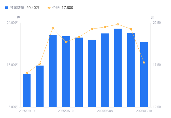 近一年(2024年9月30日至2025年9月10日),中兵红箭A股股东户数从16.16万户,增加至20.4万户,增幅26.27%,区间股价上涨32.44%。