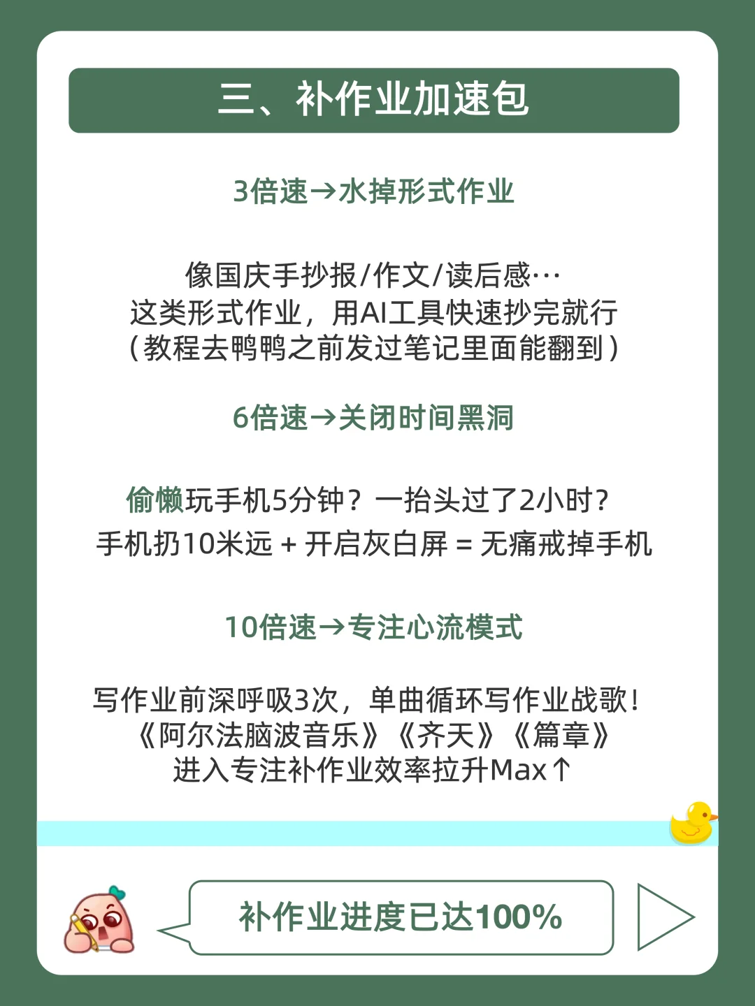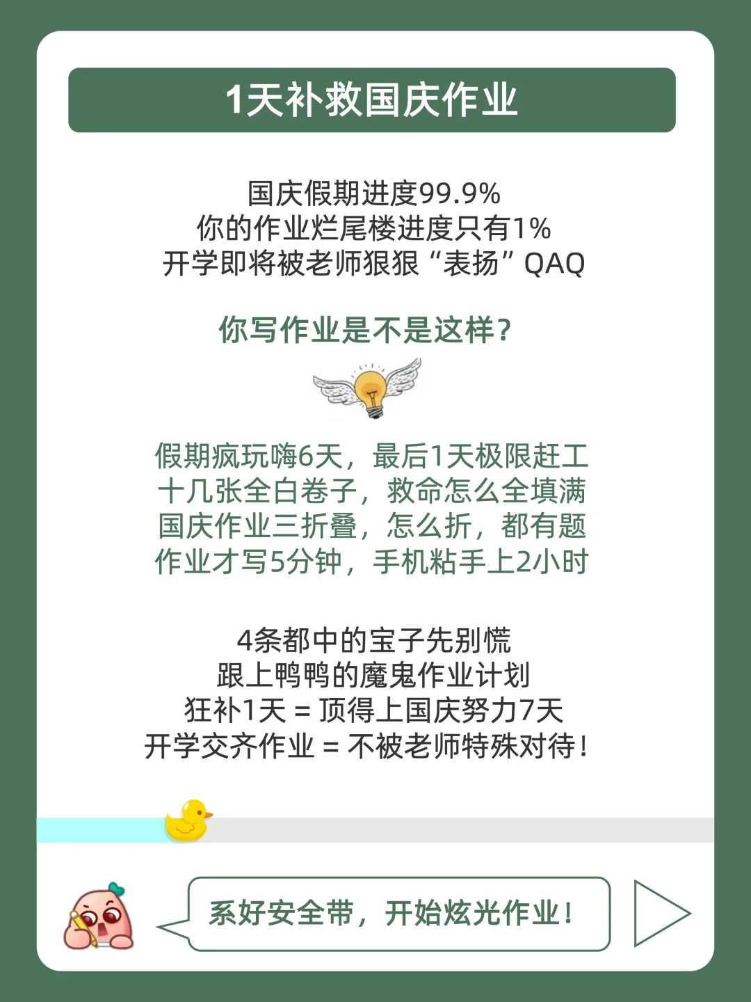 [哭惹R]国庆作业一字未动?鸭鸭带你飞速补完![鼓掌R] · [赞R]拿下这篇作业提速秘诀,炫光作业就在于此!🚀 . [偷笑R]赶紧写起来,作业写不完可是会被老师狠狠表扬的哦❗ . 🐣我是鸭鸭,持续分享更多学霸秘籍,陪宝子们学习开窍,考试开挂!💯
