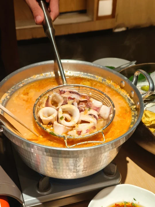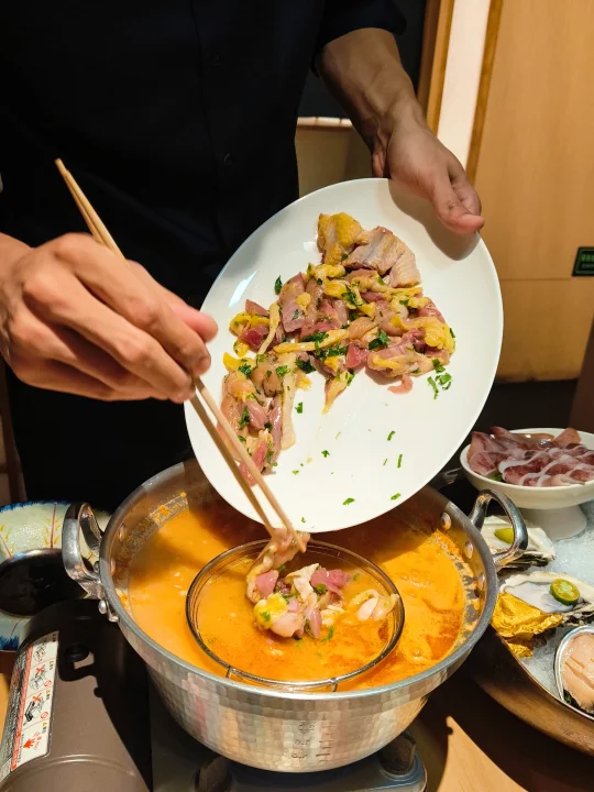 日料店,居然吃到了坠好吃的糟粕醋火锅🥘,海南酸汤锅底酸到上头、鲜到跺脚🦶! 文昌鸡🐔煮后肉质细嫩,裹着酸汤的鲜! 安格斯🐂牛五花厚切!奶香爆炸💥 海鲜拼盘🦐🦑🐠🪶里的生蚝肥润、黑虎虾鲜甜 吃完直接想定居店里… 谁懂这种疯狂!😘