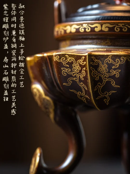 如意玉足承鼎盛之形,描金釉色流转辉光,炉腹深广容香万千。烟霞升腾间显端正之仪,以圆融气韵凝定家的核心。