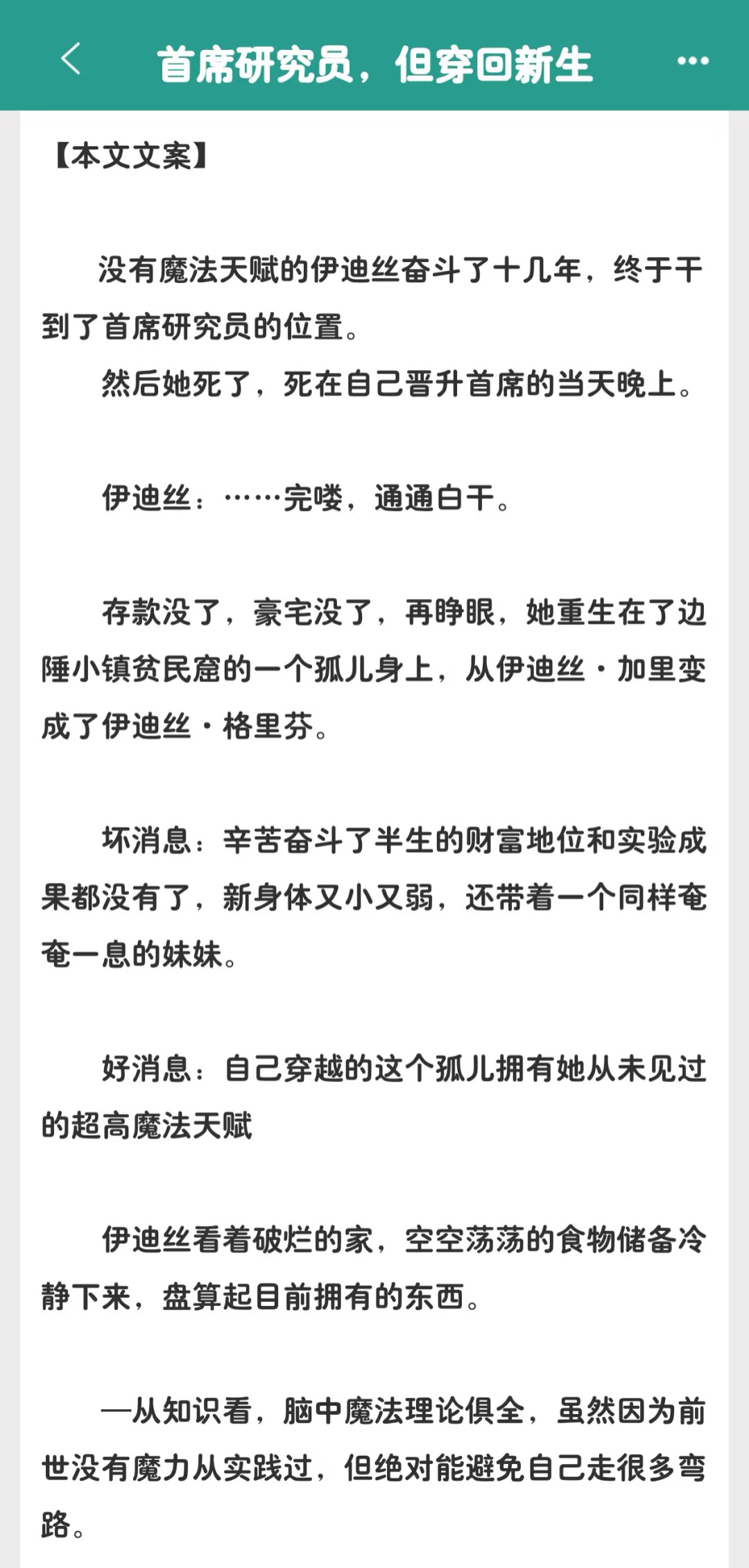 女主是研究天才,在灵魂穿越后,获得了强大的魔法天赋,是个超级卷王,且热爱魔法与魔药,强大独立野心勃勃。比赛部分很热血,女主与朋友间的友谊也很好看。