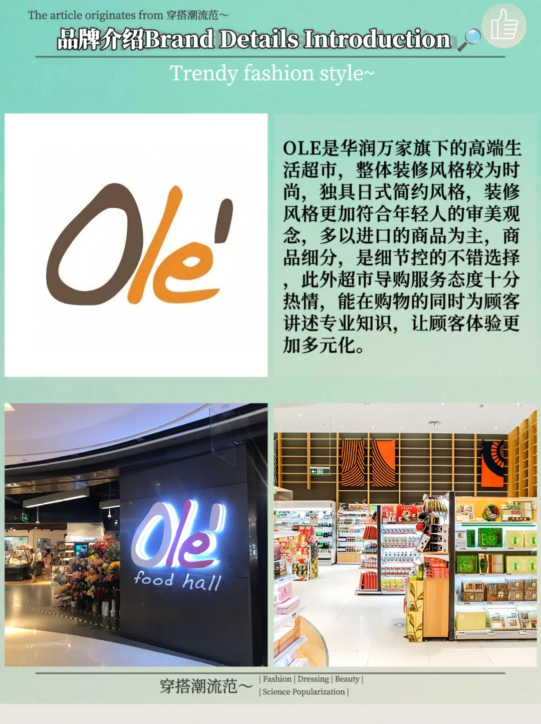 OLE是华润万家旗下的高端生活超市,整体装修风格较为时尚,独具日式简约风格,装修风格更加符合年轻人的审美观念,多以进口的商品为主,商品细分,是细节控的不错选择,此外超市导购服务态度十分热情,能在购物的同时为顾客讲述专业知识,让顾客体验更加多元化。