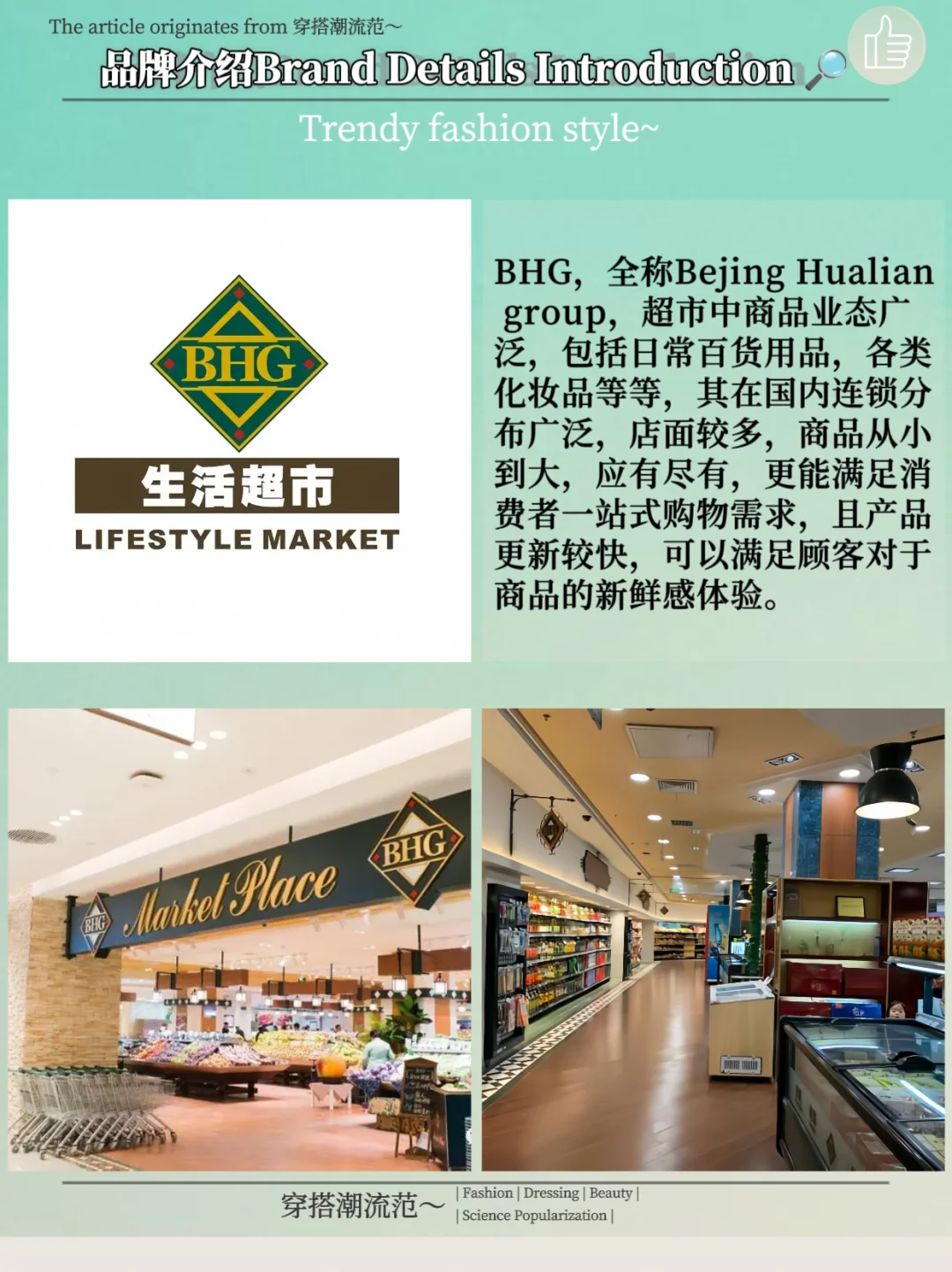 BHG,全称Bejing Hualian group,超市中商品业态广泛,包括日常百货用品,各类化妆品等等,其在国内连锁分布广泛,店面较多,商品从小到大,应有尽有,更能满足消费者一站式购物需求