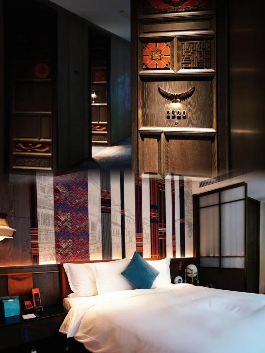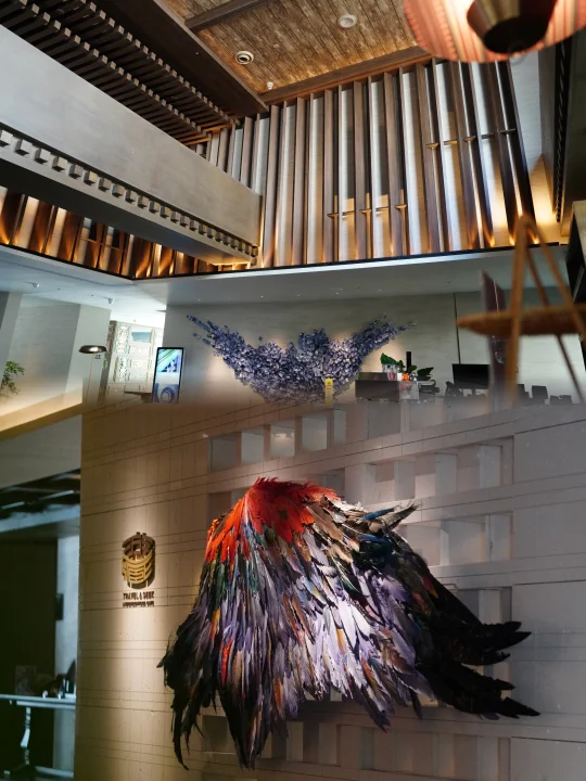 整体设计就像走进一座艺术博物馆,灵感源自格萨尔神鹰的故事。石墙、转经筒、羌绣、牦牛铃铛、八宝图腾……细节随处可见。大堂的“神鹰之翼”装置在灯光下特别震撼,仿佛把藏羌的神话带到现实。