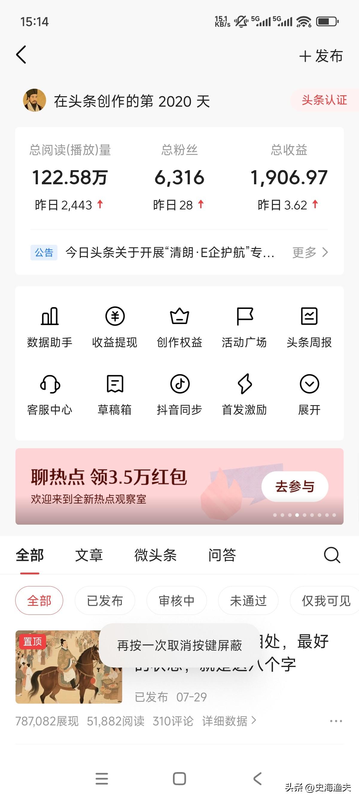 自从头条修改规则以后,我的收益呈现断崖式下滑,从每天几十块变成每天几块钱,感觉快坚持不下去了! 我这个头条号是2020年创建的,工作不忙的时候,就写一写,忙起来就顾不上了!所以5年多的时间,我这个号粉丝没破万,收益也才不到2000块。 今年6月份,我又重新在头条上更新历史类文章,主要是以《资治通鉴》的解读为主,用书中的人物案例,来讲一讲人性、讲一讲人生,讲一讲职场生存法则。 我每天坚持更新,收益从开始的几块钱,上升到十几块,再到几十块,甚至在8月25-26日连续两天突破100块。 一分耕耘,一分收获。从6月28号截止到昨天,我的粉丝从2000多涨到6300,总收益从500块增加到1800元。 虽然粉丝还不多,收益还很少,但是我很知足,因为收获了很多粉丝的关注、点赞、评论、转发和收藏,这让我觉得努力没有白费,付出真的会有收获。 不管头条规则怎么改,我的写作初心不变。不能因为收益下滑了,就失去动力了!不能因为头条给的展现量不多,我就要断更了!只要我的粉丝喜欢看,我就会一直写下去。 我始终坚信,时间是最好的朋友,我会坚定地做一个长期主义者!
