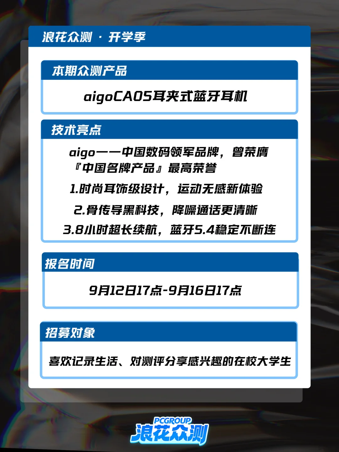 周五!周五!敲锣打鼓! 今天值得敲锣打鼓的还有 aigo CA05 耳机众测报名开放了‼ 🎧 颠覆传统!「零感佩戴」革命的耳夹式蓝牙耳机 骨传导➕定向声场,音质炸裂不漏音 闪充10分钟,狂嗨8小时! 👉 参与方式v信并guan注【PConline太平洋科技服务号】 点击下方工具栏进入小橙xu,首页见活动入口 更多详情欢迎到 评论区留言or后台[四R]信~