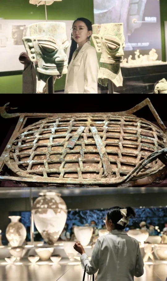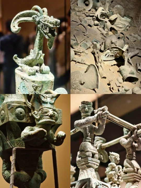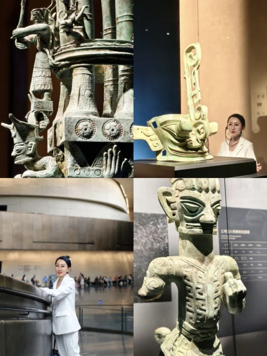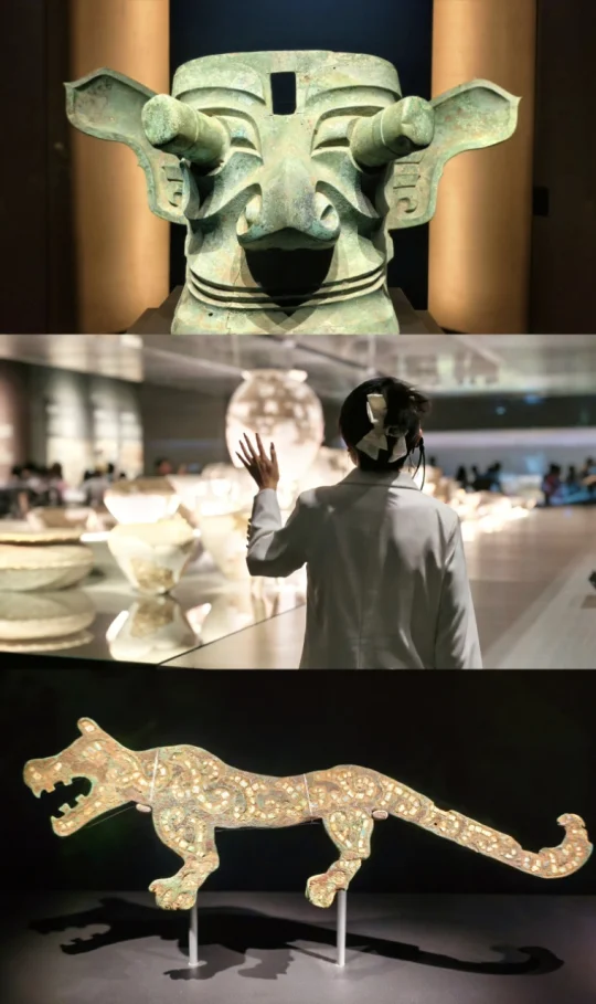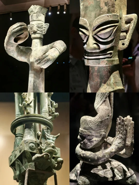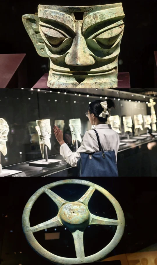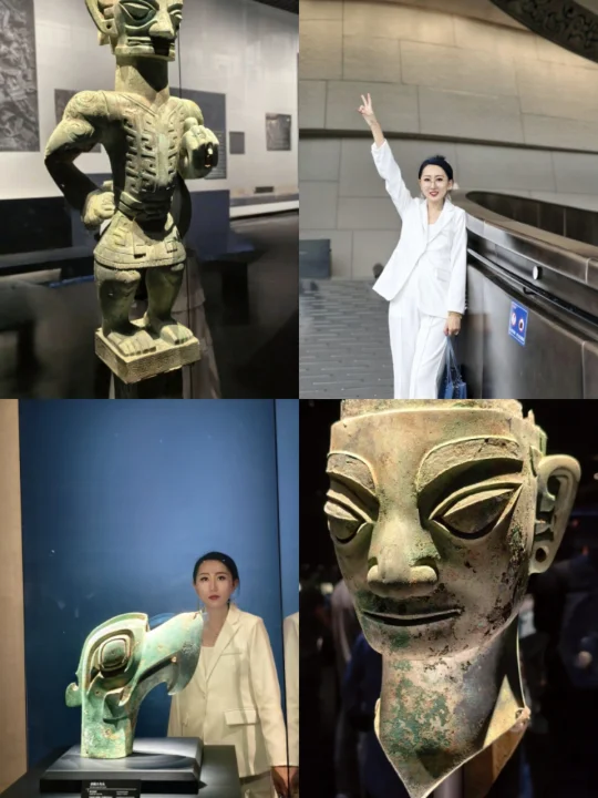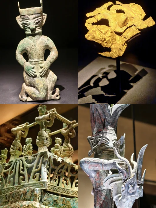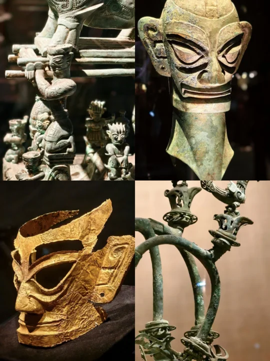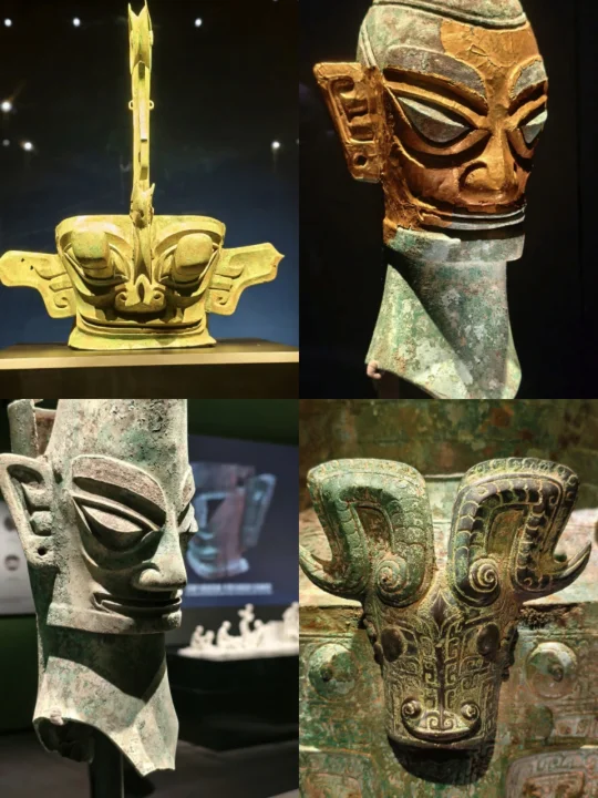站在三星堆青铜纵目面具前,我终于懂了什么叫“一眼万年”——纵目面具的柱状眼球仿佛能洞穿古今,还有那些戴着“黄金面膜”的神秘人像…明明是3000年前的古蜀文明,却长得像未来科幻片里的外星使者!🤖