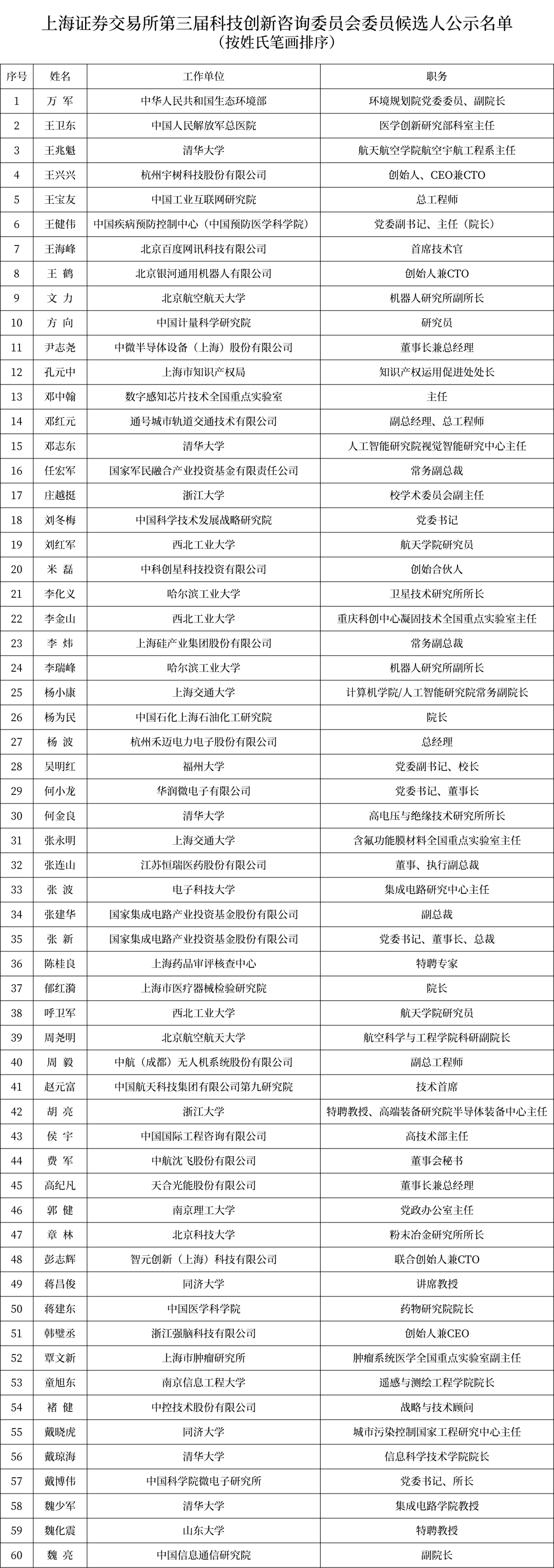 9月12日,上交所发布第三届科技创新咨询委员会委员候选人名单,共有60人组成第三届咨询委委员候选人。其中,尹志尧、王兴兴、高纪凡、张连山等多位知名企业家代表入选。