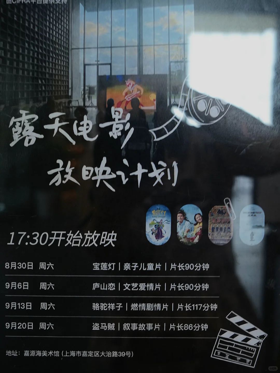 晚上还有的露天电影活动! 看介绍是与CIFRA合作的夏日葡萄放映系列,每周片单都不一样哦。在美术馆院子里吹着晚风看电影🎬,氛围感直接拉满!