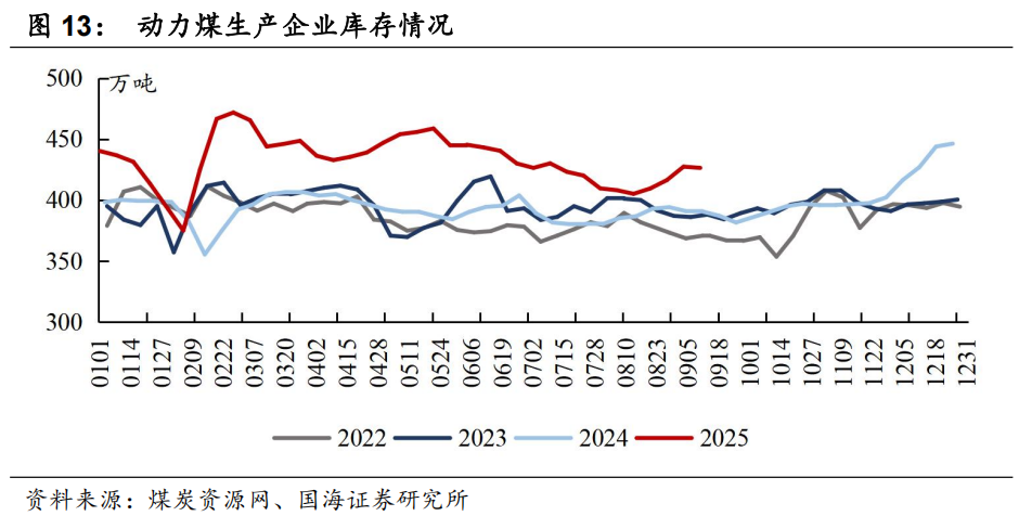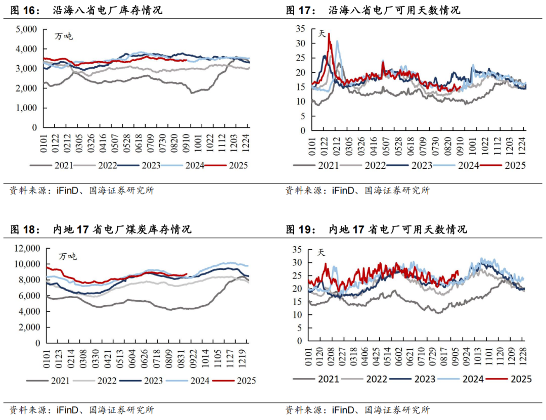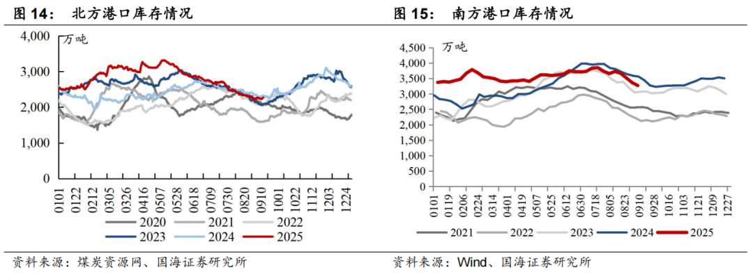 近期动力煤市场小结及展望:本周(9月5日-9月12日)港口库存保持去化,港口煤价止跌趋稳,山西、内蒙古、陕西坑口价格分别周环比上涨5.00、6.00、11.00元/吨。具体来看,(1)生产端,截至9月10日,三西地区样本煤矿产能利用率环比上升1.63pct,主要系重要活动结束后,大部分煤矿恢复正常生产所致。(2)运输端,本周市场发运环比分化,大秦线日均发运量周环比减少1.75万吨,呼铁局日均批车数周环比增加5列。但根据煤炭资源网,大秦线秋季检修初定10月7日展开,为期20天。按照往常的情况以往,届时大秦线运量将降至100万吨/天。(3)进口煤方面,近期国内电厂日耗回落,负荷下降,对进口煤招标增加,推动印尼低卡煤价格上涨,叠加印尼至华南运费较为平稳,进口煤成本坚挺,进口商给终端投标价格走势偏强。然而随价格持续上涨,下游的采购积极性减弱,进口煤价格本周呈现趋稳态势。(4)需求端,本周沿海/内地电厂日耗周环比分别下降10.0/上升9.4万吨,尽管下游日耗正处于回落期,但随着国庆长假的临近,部分电厂或将释放更多补库需求。(5)电厂库存方面,9月10日沿海+内陆25省电厂库存12169.5万吨,较2024年同期高484.4万吨。(6)非电需求端,冶金、化工等终端用户按需采购,本周化工耗煤环比下降1.09%,铁水产量本周环比上升11.84万吨,水泥开工率截至9月4日环比上升1.32pct。(7)港口端,本周北方港口库存周环比下降2.30万吨,同比去年同期下降61.60万吨。整体来看,本周供需在阅兵后均有恢复,港口库存维持去化,港口煤价随上游挺价与部分空单和刚需询货而逐步止跌趋稳。本周港口动力煤680元/吨(周环比+1元/吨),后续关注大秦线检修以及国庆节前下游补库对煤价形成的供需双支撑影响,预计煤价短期维持震荡偏强走势