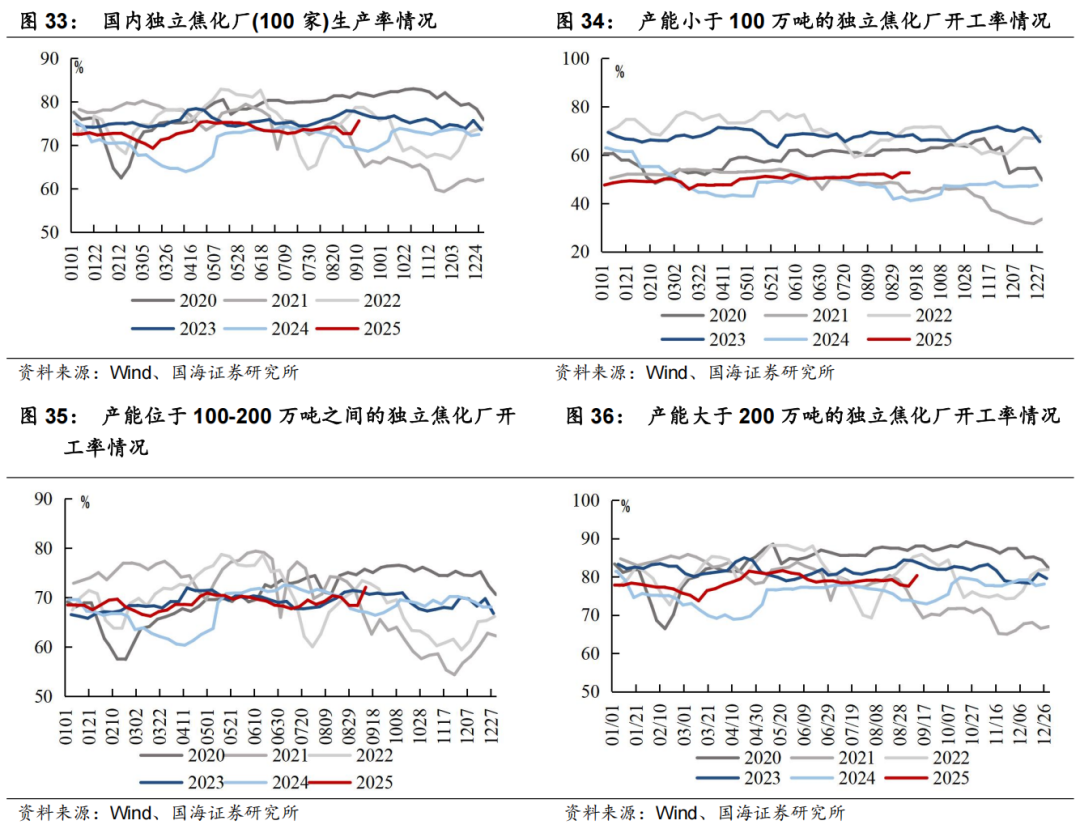 本周焦化厂生产率环比上涨:截至9月12日,国内独立焦化厂(100家)焦炉生产率75.6%,周环比上涨3.0个pct,产能小于100万吨的焦化企业(100家)开工率52.76%,环比上涨0.1个pct,产能在100-200万吨的焦化企业(100家)开工率72.07%,环比上涨3.7个pct,产能大于200万吨的焦化企业(100家)开工率80.33%,环比上涨2.8个pct。