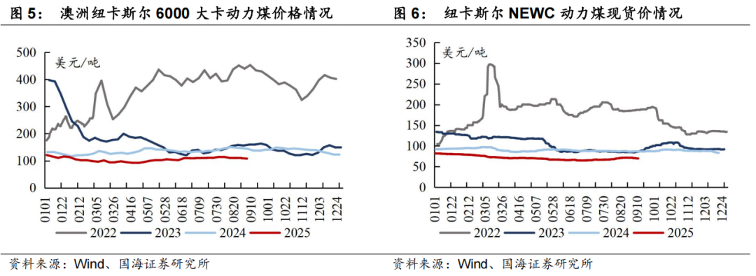 截至9月5日,国际6000大卡动力煤价格环比下降,本周国际5500大卡动力煤价格环比下降:截至9月5日,纽卡斯尔6000大卡动力煤价格为107.78美元/吨,周环比下降1.5美元/吨;截至9月11日,纽卡斯尔5500大卡动力煤(2#)价格为69.45美元/吨,周环比下降1.1美元/吨。
