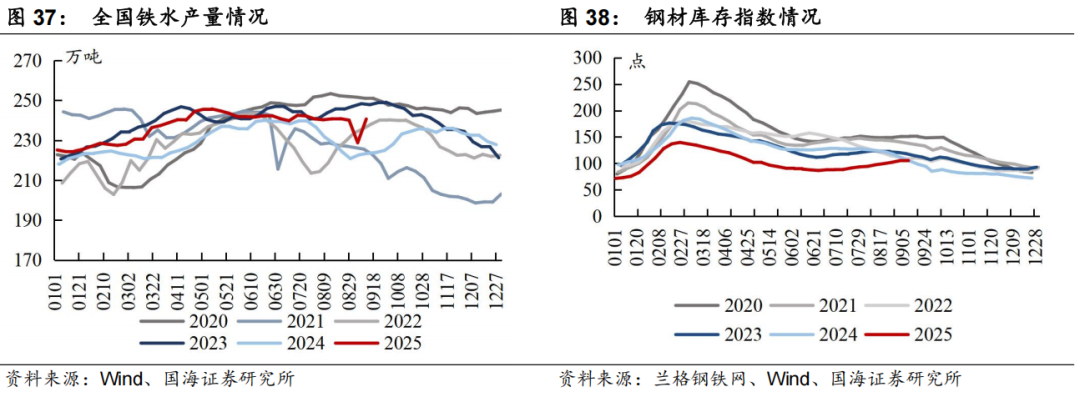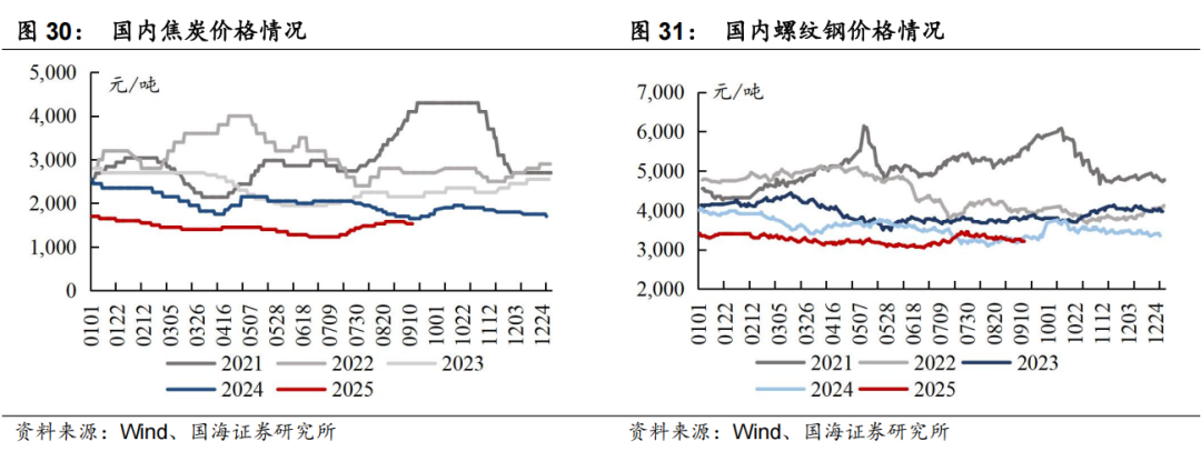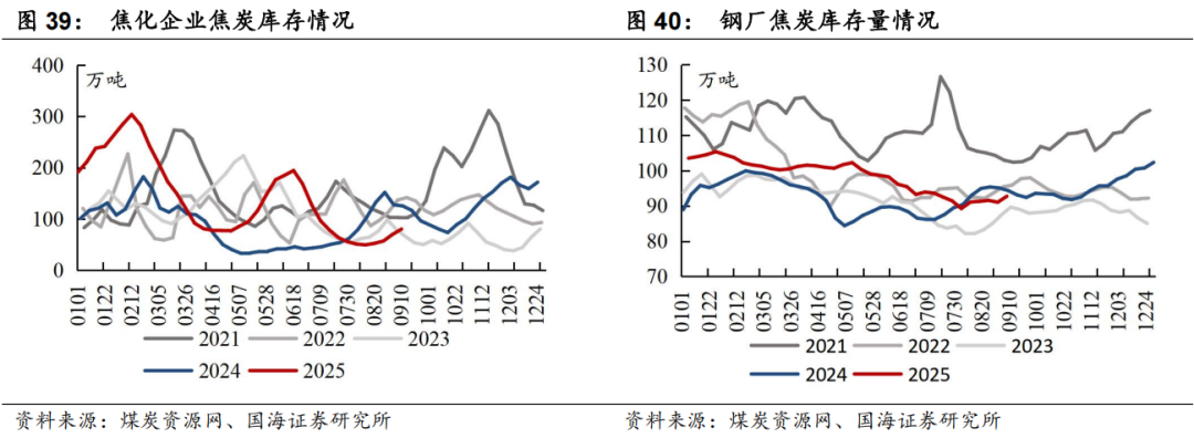 炼焦煤和焦炭来看,对于炼焦煤,本周样本煤矿(9/3-9/10)产能利用率环比上升4.08pct至85.3%,主要系阅兵结束后煤矿恢复生产所致。蒙煤方面,本周甘其毛都口岸通关车数维持高位运行,本周甘其毛都口岸平均通关量为1,294车(七日平均值),周环比上升293车。需求端,下游复工复产,铁水产量本周环比上升11.84万吨,刚需有支撑。焦化厂方面,焦炭落实首轮降价后焦企利润收缩,叠加看跌预期仍存,多数企业以消化厂内原料库存为主,补库意愿偏低。库存端,本周焦煤生产企业库存周环比上升0.38万吨。整体来看,阅兵后供需双增、矿端库存小幅增长,整体矛盾不大。不过随着焦炭第二轮提降开启,煤价有一定压力,但考虑国庆前下游的补库动作,煤价预计维持震荡趋势,截至9月12日港口主焦煤1,540.00元/吨(周环比持平),后续关注煤矿复产情况、下游补库情况、钢材旺季需求表现等因素。对于焦炭,供给端,由于焦企前期利润较为可观,焦炭首轮落地后多数焦企保持盈利状态,且焦企的限产政策随阅兵结束而解除,带动本周焦企供应上移,本周焦企产能利用率环比上升0.56pct至74.96%。需求端,铁水产量本周环比上升11.84万吨,钢厂目前多保持按需采购,整体需求有一定支撑。库存方面,本周部分焦企场内库存开始累积,不过焦企库存增量有限,仍处在偏低水平,矛盾不大。整体来看,焦炭供需及库存短期矛盾不显著,在提降压力下,价格预计震荡偏弱走势,后续同样关注焦炭提降情况、钢材需求情况、上游焦煤价格情况等。
