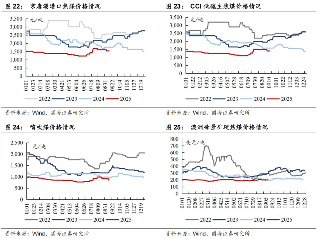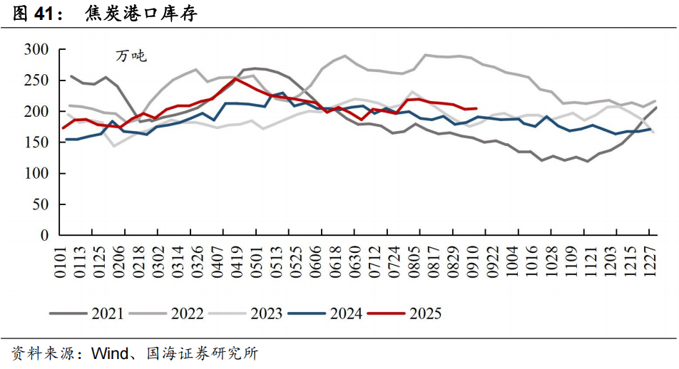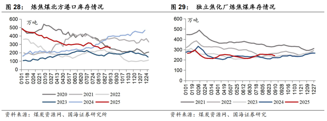 动力煤来看,本周(9月5日-9月12日)港口库存保持去化,港口煤价止跌趋稳,山西、内蒙古、陕西坑口价格分别周环比上涨5.00、6.00、11.00元/吨。具体来看,(1)生产端,截至9月10日,三西地区样本煤矿产能利用率环比上升1.63pct,主要系重要活动结束后,大部分煤矿恢复正常生产所致。(2)运输端,本周市场发运环比分化,大秦线日均发运量周环比减少1.75万吨,呼铁局日均批车数周环比增加5列。但根据煤炭资源网,大秦线秋季检修初定10月7日展开,为期20天。按照往常的情况以往,届时大秦线运量将降至100万吨/天。(3)进口煤方面,近期国内电厂日耗回落,负荷下降,对进口煤招标增加,推动印尼低卡煤价格上涨,叠加印尼至华南运费较为平稳,进口煤成本坚挺,进口商给终端投标价格走势偏强。然而随价格持续上涨,下游的采购积极性减弱,进口煤价格本周呈现趋稳态势。(4)需求端,本周沿海/内地电厂日耗周环比分别下降10.0/上升9.4万吨,尽管下游日耗正处于回落期,但随着国庆长假的临近,部分电厂或将释放更多补库需求。(5)电厂库存方面,9月10日沿海+内陆25省电厂库存12169.5万吨,较2024年同期高484.4万吨。(6)非电需求端,冶金、化工等终端用户按需采购,本周化工耗煤环比下降1.09%,铁水产量本周环比上升11.84万吨,水泥开工率截至9月4日环比上升1.32pct。(7)港口端,本周北方港口库存周环比下降2.30万吨,同比去年同期下降61.60万吨。整体来看,本周供需在阅兵后均有恢复,港口库存维持去化,港口煤价随上游挺价与部分空单和刚需询货而逐步止跌趋稳。本周港口动力煤680元/吨(周环比+1元/吨),后续关注大秦线检修以及国庆节前下游补库对煤价形成的供需双支撑影响,预计煤价短期维持震荡偏强走势。