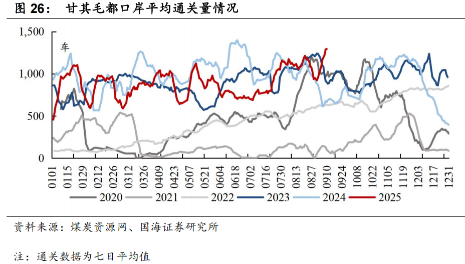 本周甘其毛都口岸平均通关量环比上升:截至9月10日,甘其毛都口岸平均通关量为1294车(七日平均值),周环比上升293车。