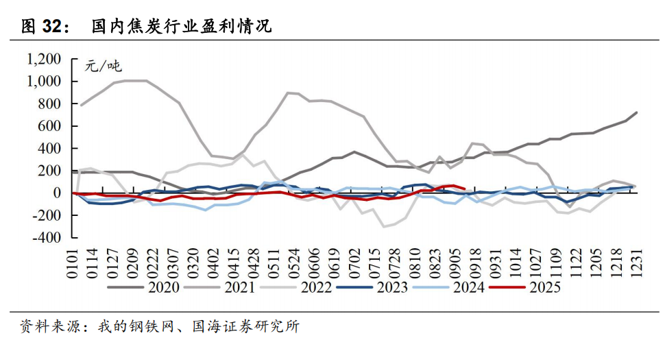 本周国内焦炭行业盈利环比下降:截至9月11日,全国平均吨焦盈利约为35元/吨,周环比下降29元/吨。