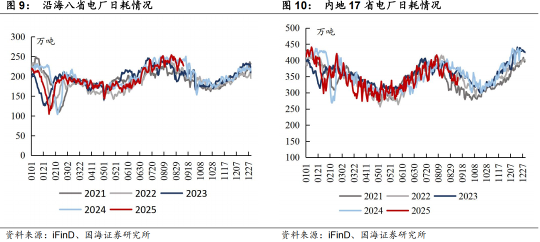 本周沿海八省电厂、内地17省电厂日耗环比分别下降、上升:截至9月10日,沿海八省电厂日耗为226.9万吨,周环比下降10.0万吨;截至9月10日,内地17省电厂日耗为346.5万吨,周环比上升9.4万吨。