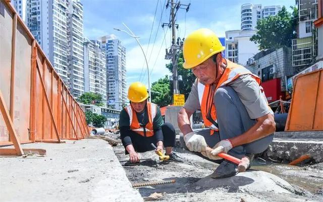 针对友谊阳光城积水点的改造,海口市制定了“抬高+疏通+完善”的综合方案。“一方面,对友谊阳光城门口路面进行标高提升,平均抬高32厘米,从根本上改善低洼积水问题。”施工单位广东明晔建设工程有限公司海关沟项目总工黄凌介绍,“另一方面,全面疏通下游淤堵管道,并新建一条直径800毫米、全长103米的雨水管道,进一步完善排水系统,确保雨水快速顺畅排出。”