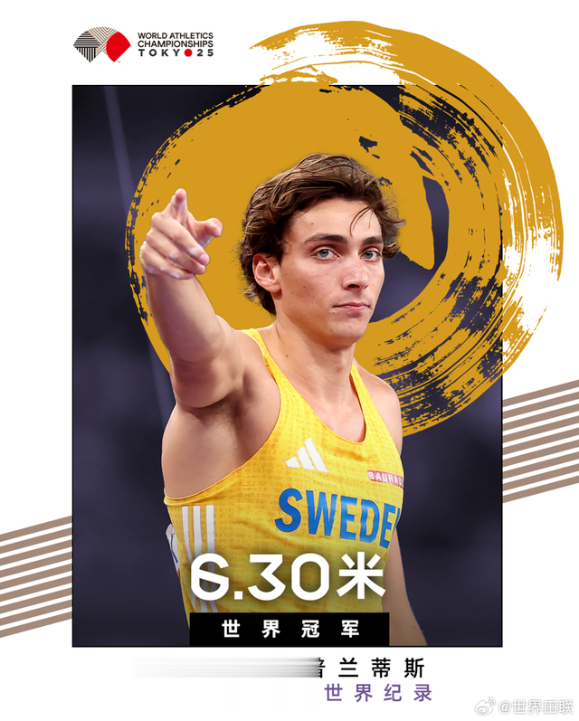2025东京田径世锦赛今晚诞生首项世界纪录。在男子撑杆跳高决赛中,瑞典运动员杜普兰蒂斯跃过6.30米,在实现世锦赛三连冠的同时,再一次改写自己保持的世界纪录。