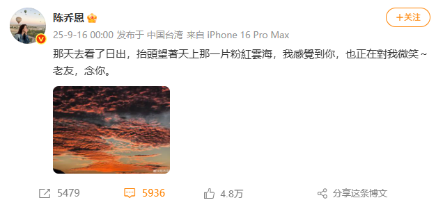 此外,2024年9月16日,演员陈乔恩也曾晒粉色天空悼念乔任梁。