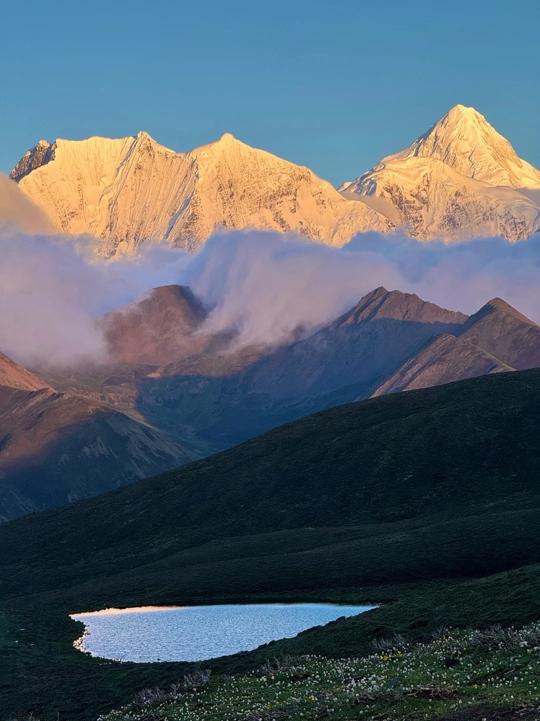 当山川近在眼前 祖国真的太美好了 第一次这么近距离的看到日照金山 下午五点半到达山顶峰的时候刚刚好 六点十分逐渐变成粉色山丘 每个时刻都不一样的美 去山顶一定要穿好冲锋衣 棉服 因为真的好冷 注意保暖 💛