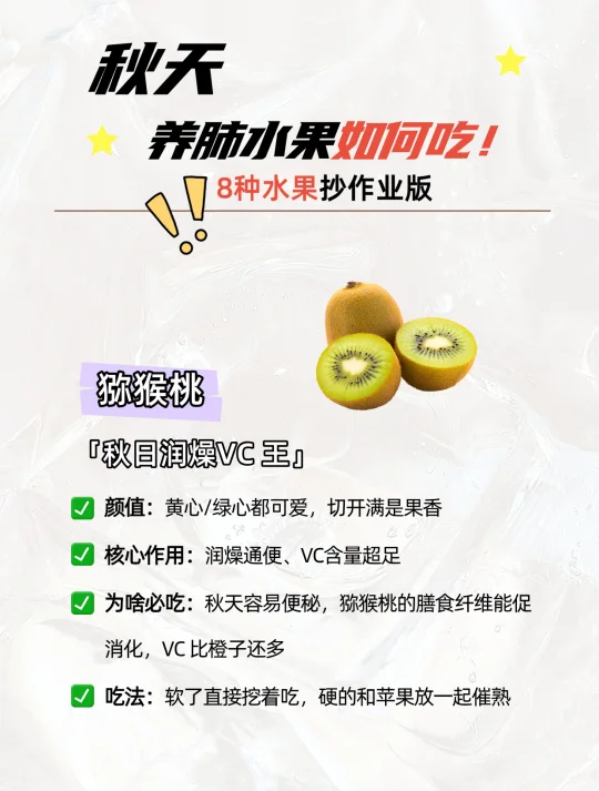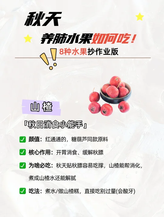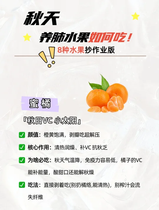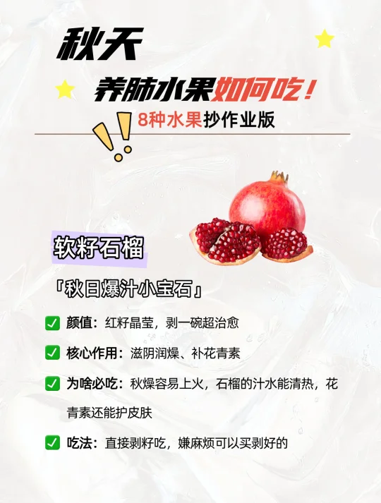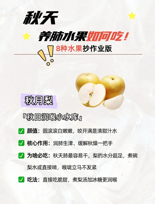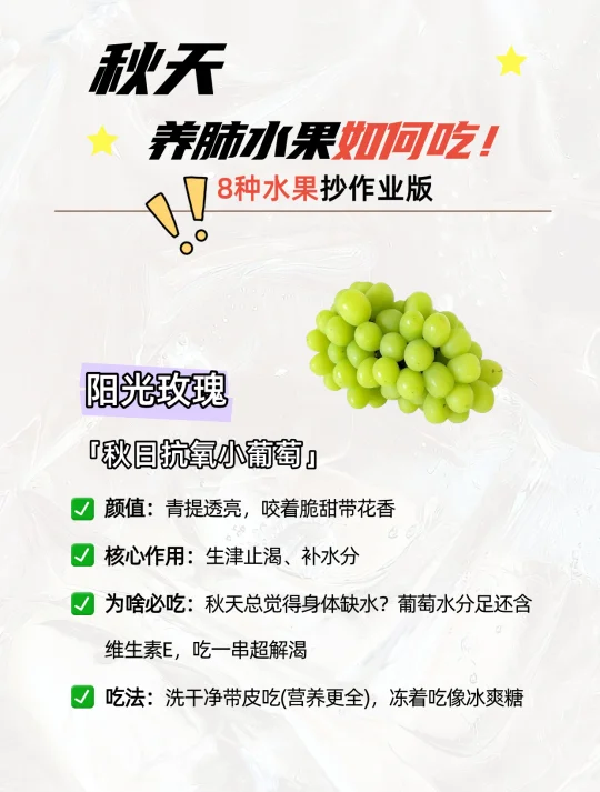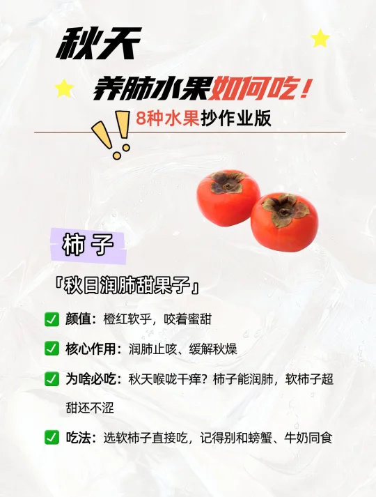 宝子们!到了秋天就感到口干、皮肤紧绷?风一吹喉咙都发燥,这都是 “秋燥” 在搞事! 不用慌,跟着应季水果吃就对了!选对润肺、清热的果子,每天啃两口,口干舌燥、秋乏全退散,还能补满维生素,直接抄作业不踩雷👇 💡小提醒:水果要吃应季的才够鲜!每天吃200-350g,秋燥、口干全躲远~