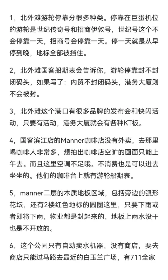 2,北外滩国客船期表会告诉你,游轮停靠封不封闭码头,如果写了:内贸不封闭码头,港务大厦则不会被封。