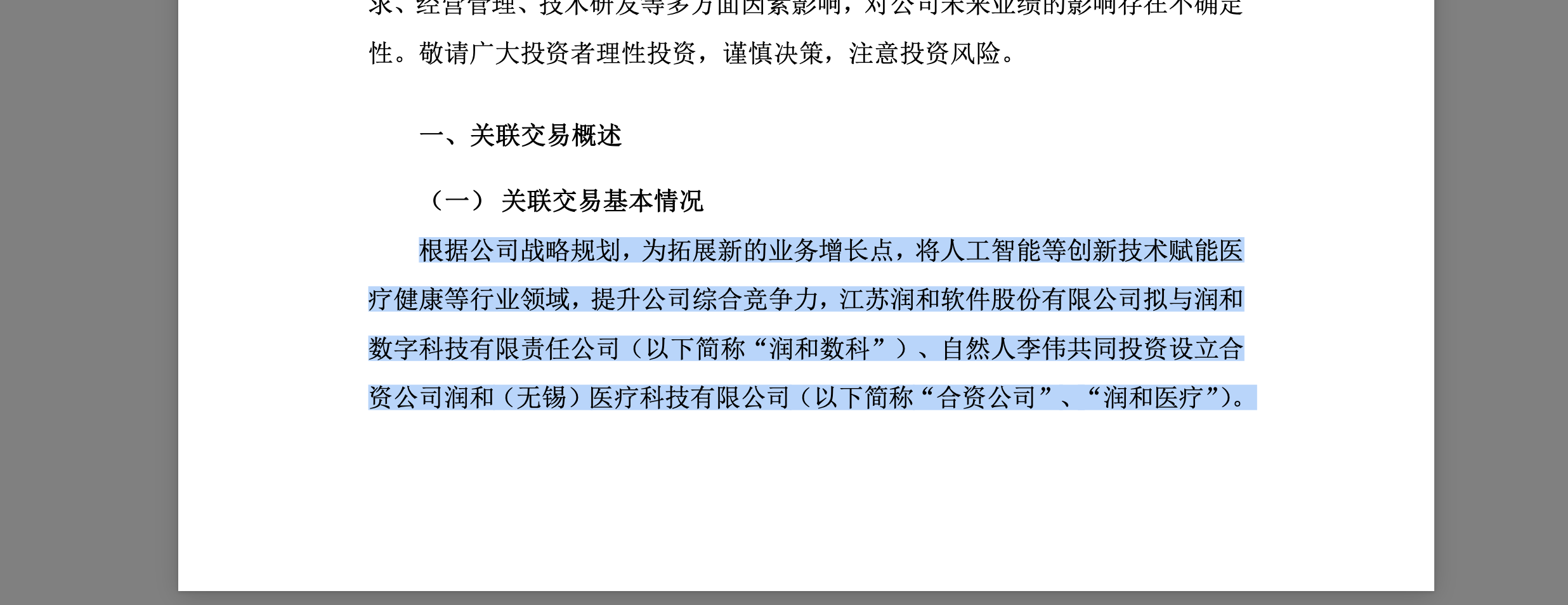 润和软件此前曾发布公告称,公司拟与润和数字科技有限责任公司、自然人李伟拟共同投资设立合资公司。新公司将运用人工智能技术赋能医疗健康行业,提升公司综合竞争力。